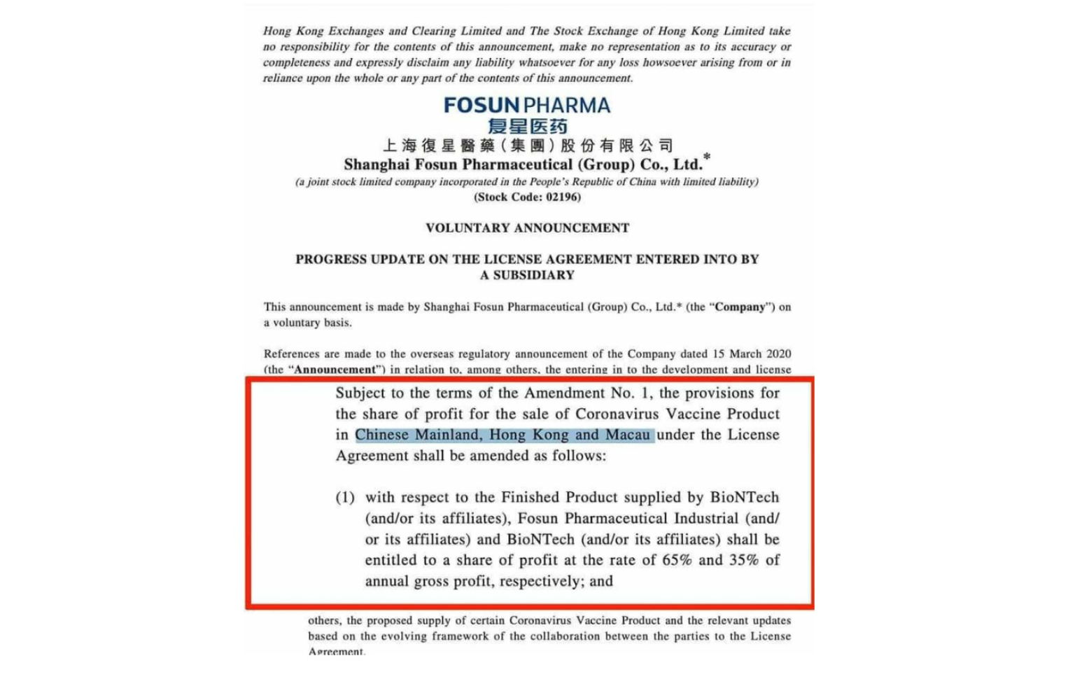 實際上,根據消息來源所提供德國原廠和上海復星公司的合約內容顯示,上海復星代理BNT疫苗,只有中國、香港、澳門,並不包括台灣,消息來源指出,但上海復星因為是BNT的大股東,還是可以從德國母公司那邊來阻撓,阻撓的手段可能就是疫苗送達地點可能會寫「中國台灣」,來矮化台灣。