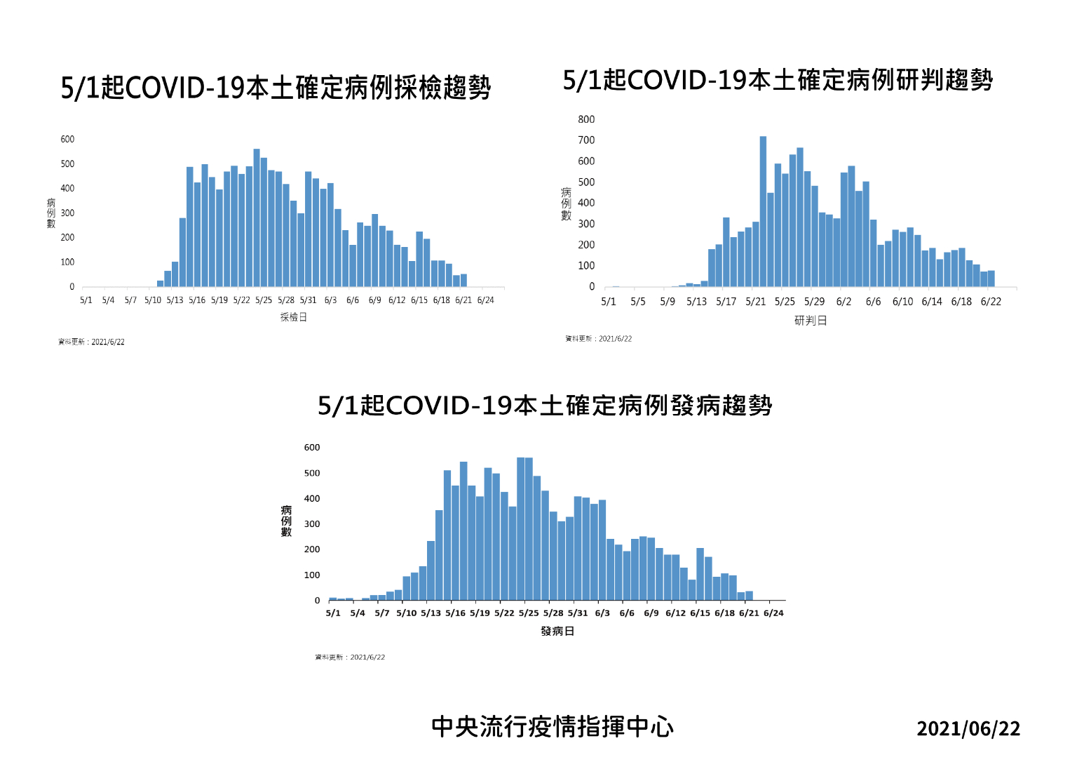 指揮中心指揮官陳時中表示,今日新增之78例本土病例,為35例男性、43例女性,年齡介於未滿5歲至90多歲,發病日介於今年6月14日至6月21日。個案分佈以新北市43例最多,其次為臺北市25例,南投縣3例,基隆市2例,苗栗縣、彰化縣、桃園市、臺中市及新竹縣各1例。其中雙北地區以外縣市10例中,8例為已知感染源,2例關聯不明;相關疫情調查持續進行中。