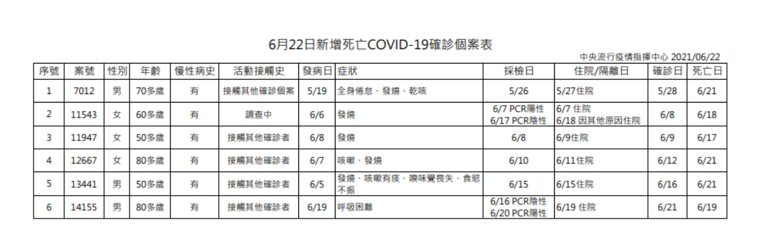 陳時中說明,今日新增6例死亡個案,為男性3位、女性3位,年齡介於50多歲至80多歲,發病日介於5月19日至6月19日,確診日介於5月28日至6月21日,死亡日介於6月17日至6月21日,詳如新聞稿附件。