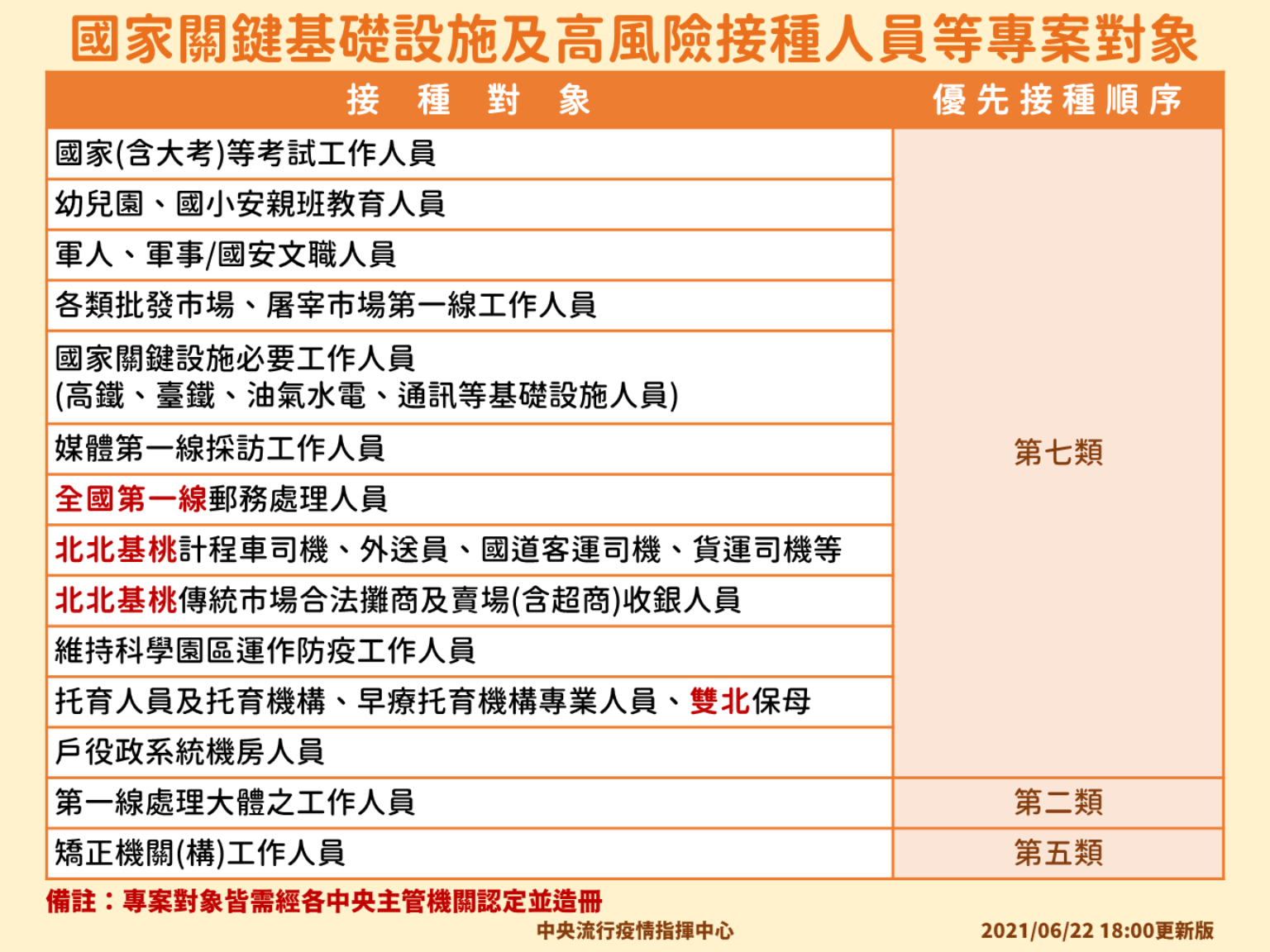 不過,指揮中心發言人莊人祥強調,第七類為專案造冊人員才可以施打,不是符合職業都可以施打。因此,第七類人員的疫苗由中央控管,並不會包含在指揮中心下一批配發給各縣市的110萬劑莫德納疫苗裡,指揮中心將依據各主管機關造冊及施打計畫來配發疫苗,屆時可能會展開外展服務或配發到醫院施打。