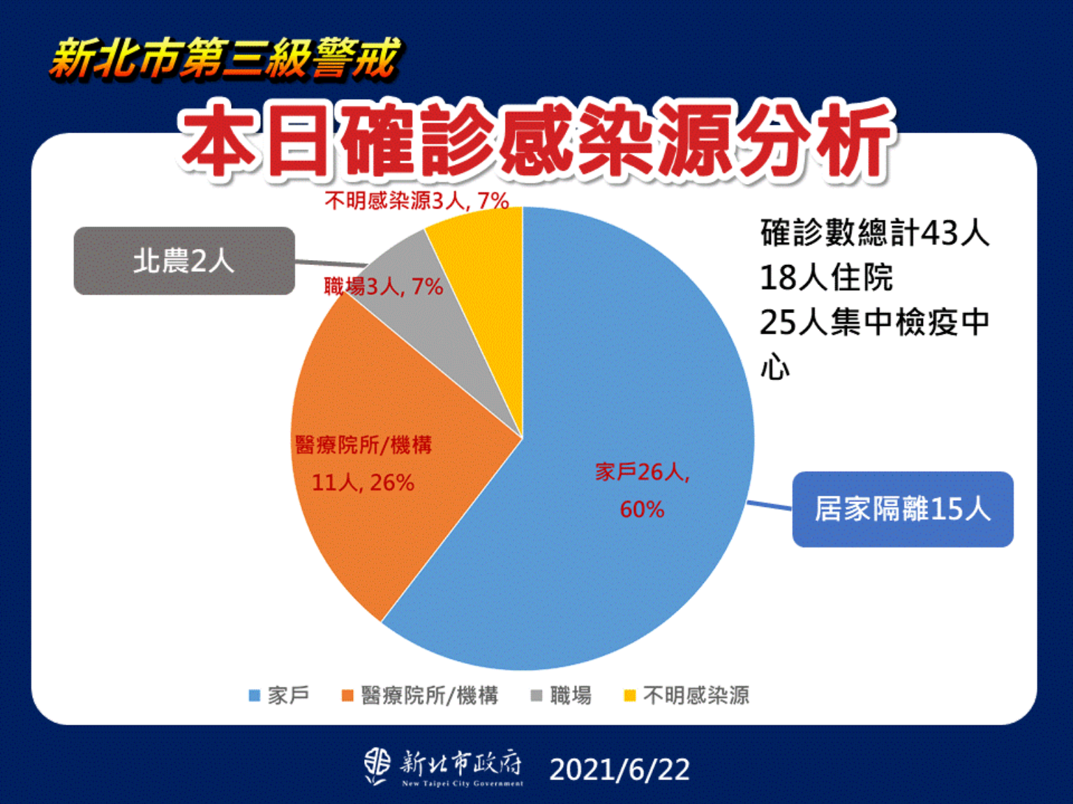 中央流行疫情指揮中心今天宣布全台有78例本土確診案例,新北市有43例,目前總計有6204例,居家列管中的有2330人,解隔離共3960人,43例新增個案中有26人是家戶感染占26人,醫療院所11人,北農2人,不明感染則是1人。