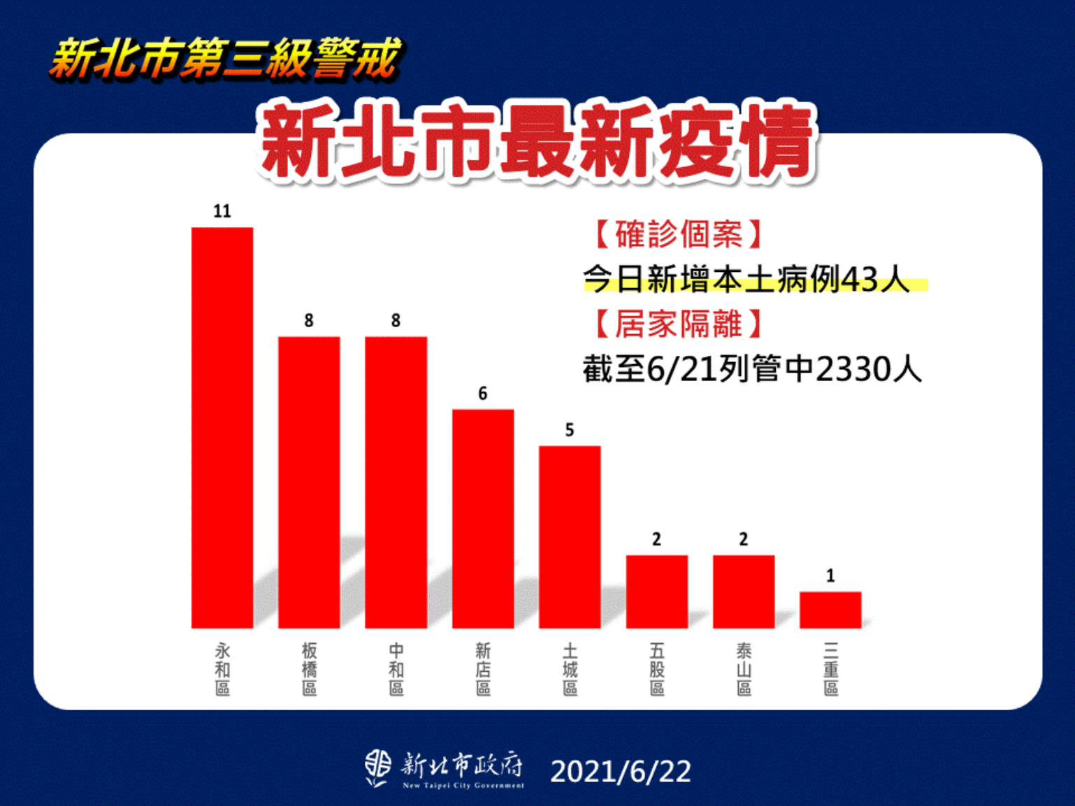 新北市今天的確診分佈以永和區11例、板橋、中和區8例、新店區6例最多,特別被侯友宜提出來做說明的是永和的兩起家庭群聚案,他表示永和昨天是零確診,今天卻暴增11例,其中的1例確診者是在居家隔離結束前再做PCR採檢才驗出確診,擴大對他的同住家人採檢,才發現全家其他4人全部確診,再加上另一起於工作場所染疫後傳染給家人,兩起家庭群聚加起來就有9人。