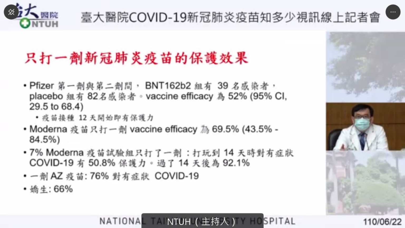 為了解決民眾的諸多疑惑,台大醫院在22日上午召開線上記者會,台大醫院院長吳明賢指出,台大這段期間除了照護病患,也關注很多國外的研究資訊,很多資訊也隨著疫情做滾動式修正,國外大學醫院有設立新冠肺炎訊息的專區,台大也組成專業團隊針對許多新冠疫苗的問題討論,為民眾一一解惑。