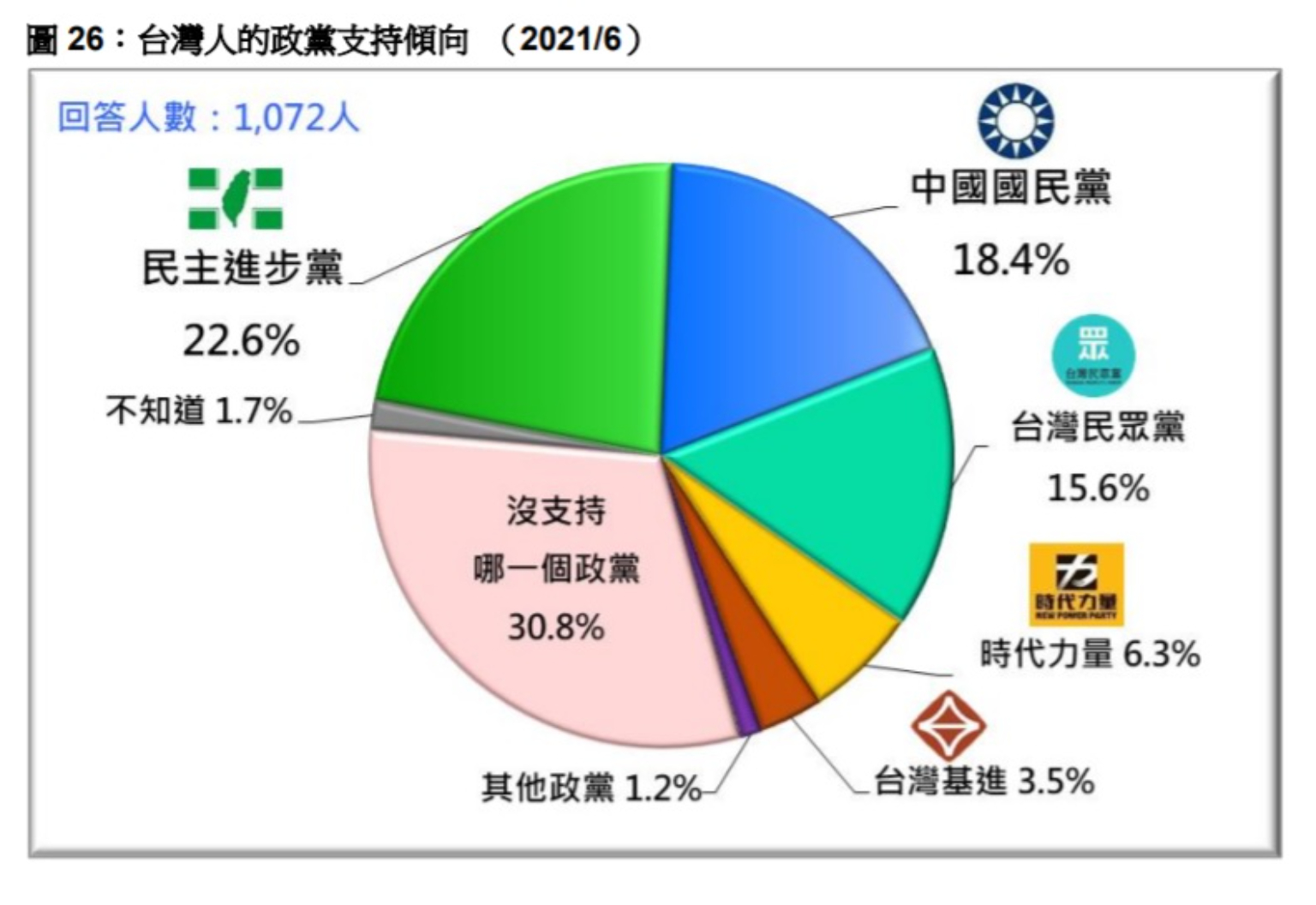 若從政黨支持度來看,民調顯示,22.6%支持民進黨,18.4支持國民黨,15.6%支持民眾黨,6.3%支持時代力量,3.5%支持台灣基進,其他政黨合計1.2%,30.8%沒特別支持哪一個政黨,1.7%不知道、拒答。