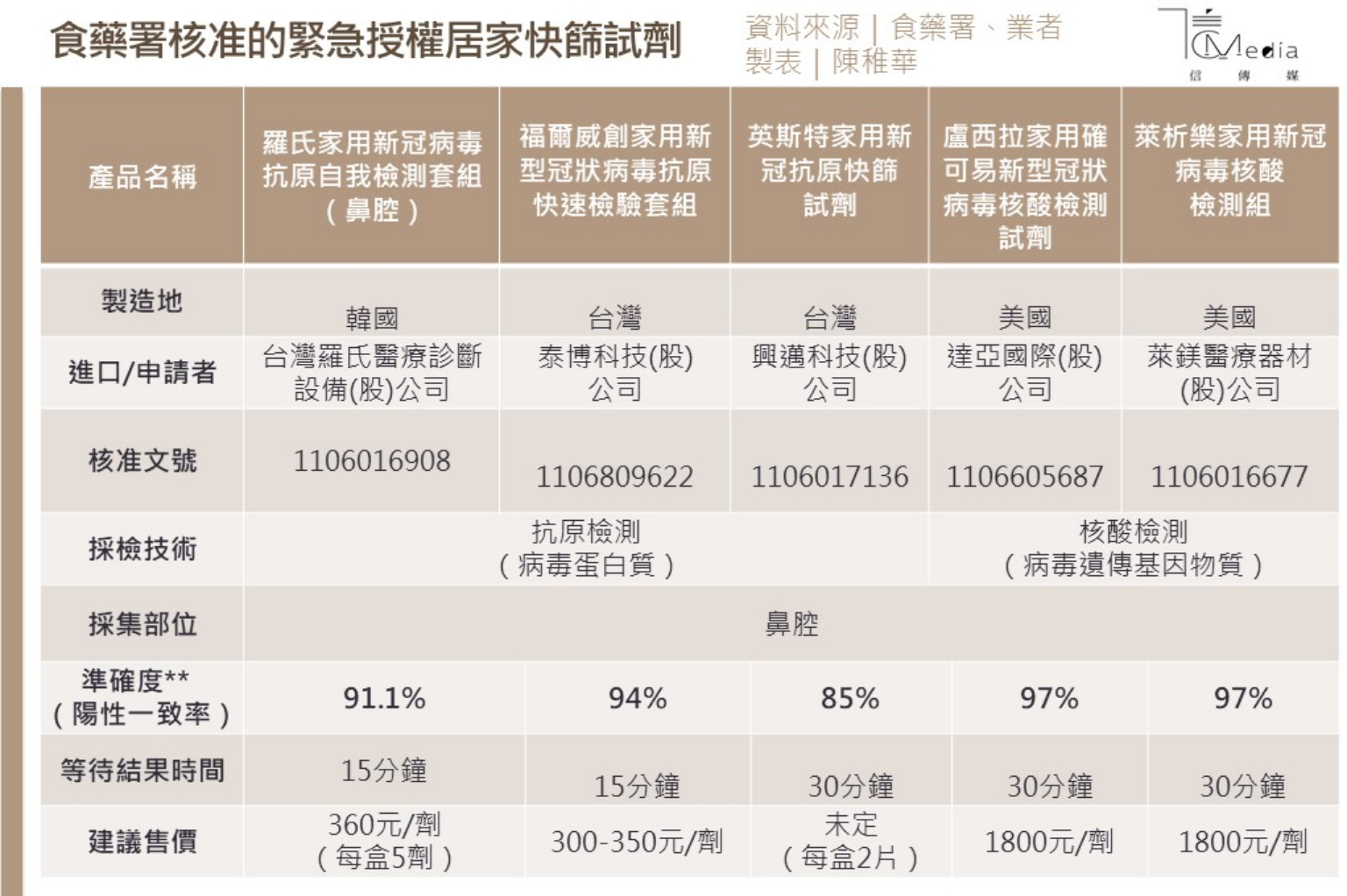 台灣本土新冠疫情依然延燒,衛福部食藥署(TFDA)目前已通過5家業者專案進口居家快篩試劑的緊急授權(EUA),產品建議價格每劑約300元到1800元不等,將於藥局、超商、藥妝店等通路販售。