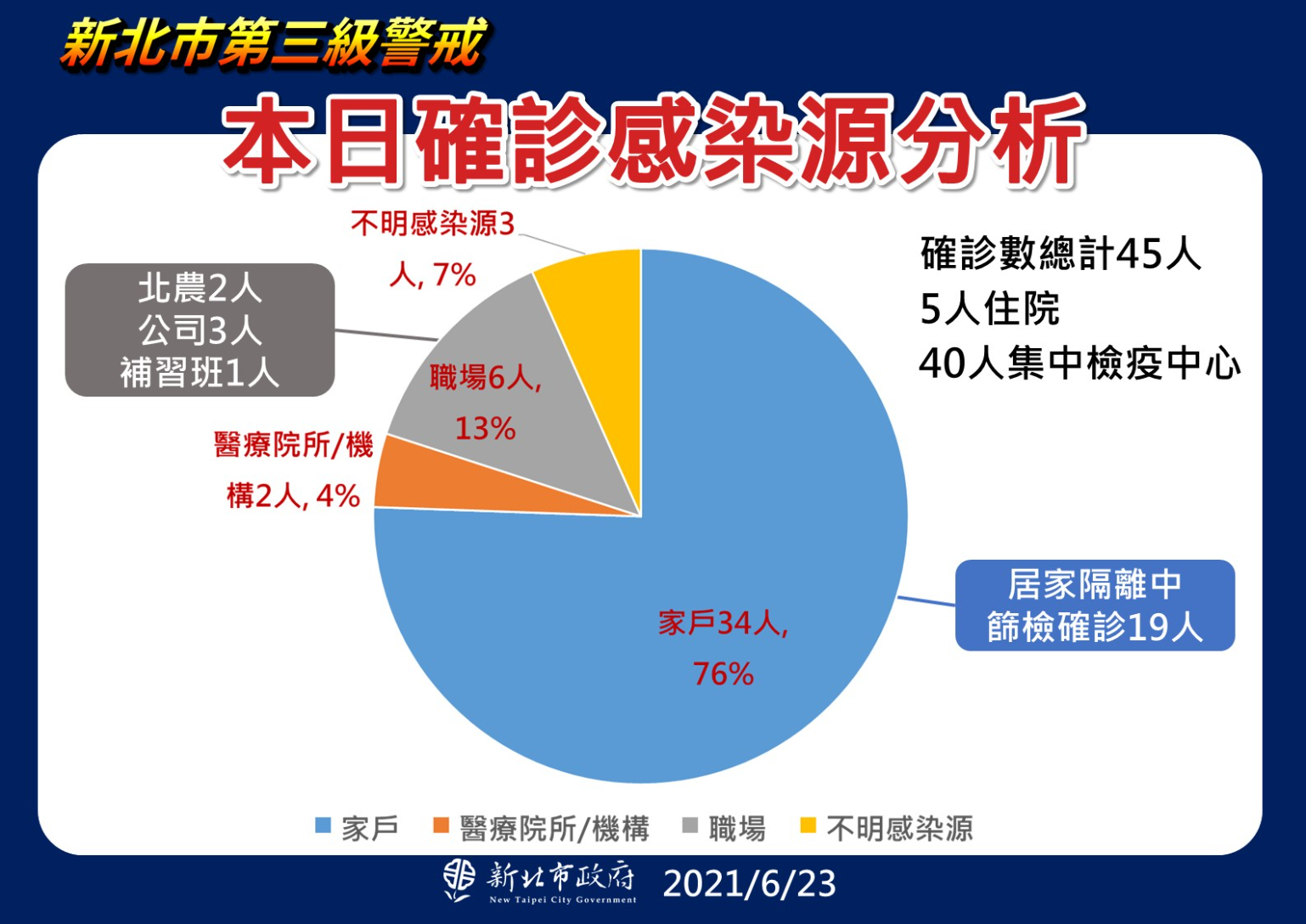 新北市今天新增45例確診,以中和10例、三重7例、板橋與新莊各6例最多,總計已有6247例確診,其中4143人已解除隔離,居家列管中有2212人,今日新增的確診者中家戶感染有34人占比高達76%,不明感染仍有3人。