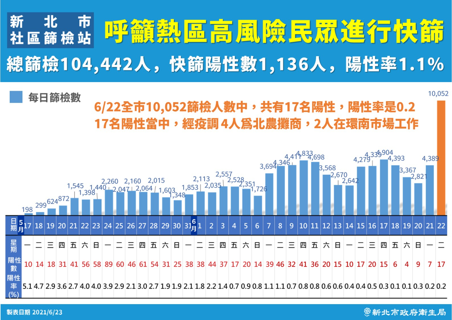 因應北農群聚,新北市在昨天又派出機動快篩隊進駐兩大果菜市場,一整天下來共篩檢了3627人全數陰性,而昨天總篩檢量破萬人來到1萬52人創新高,其中有17人陽性,陽性率0.2%,有4個是北農攤商、2個在環南市場工作。