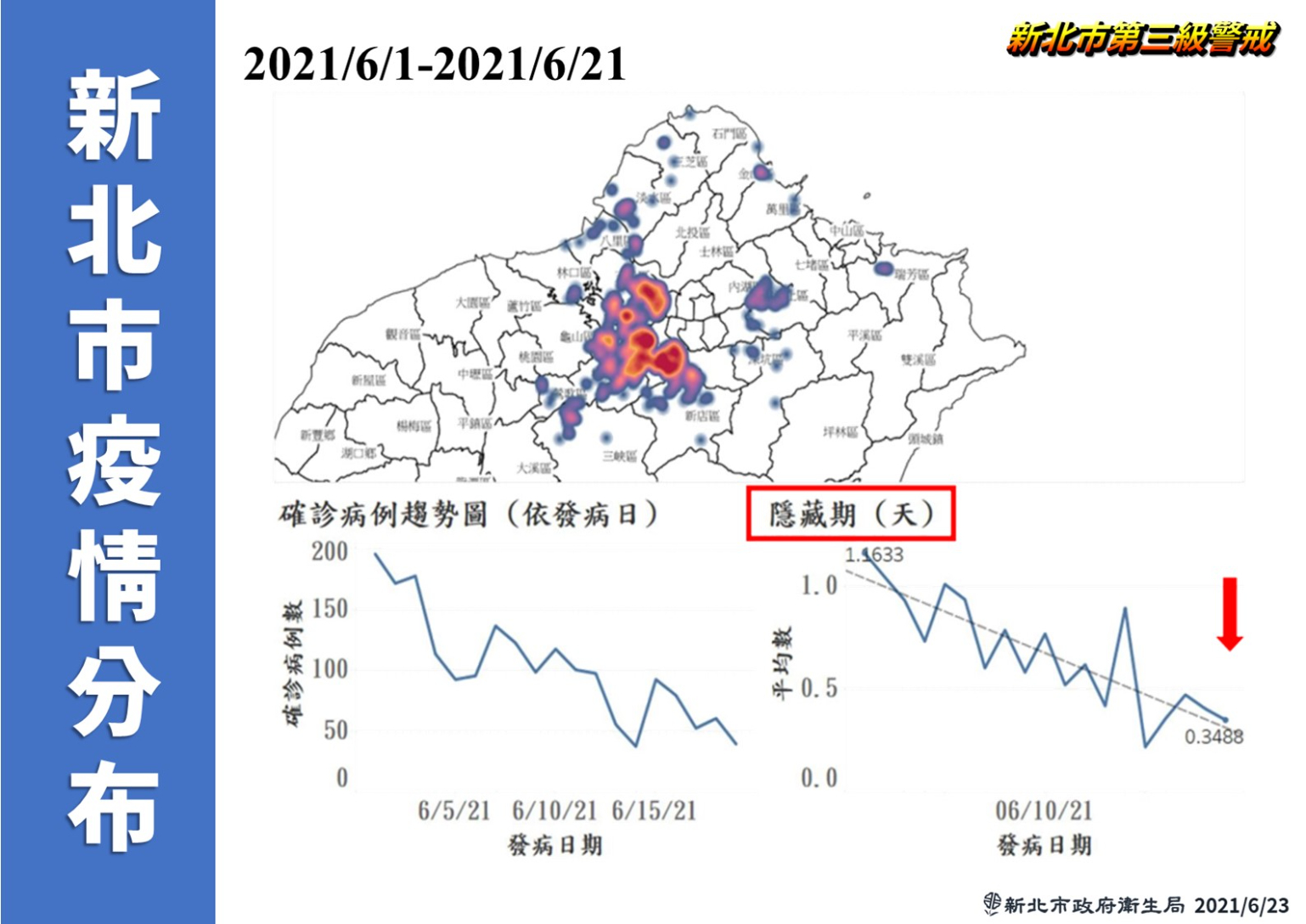 侯友宜今天再請台大公共衛生學院教授陳秀熙來針對新北疫情現況做說明,他認為這一兩週的確診數來看,新北市在疫情上的控制已經到國際科學防疫的典範,自5月15日雙北三級警戒再到3天後的全國警戒之後,確診病例至今降至非常少,他認為這就是科學防疫上的一個成就,在疫苗施打完成之前,警戒措施必須搭配快篩,才是有效阻斷小群聚感染的方式,而新北市因為過去快篩站快速成立,可看到Rt值已降到0.4,同時拿出英國的疫情分析做比較,認為新北市做的比英國要好,擁有世界級水準。