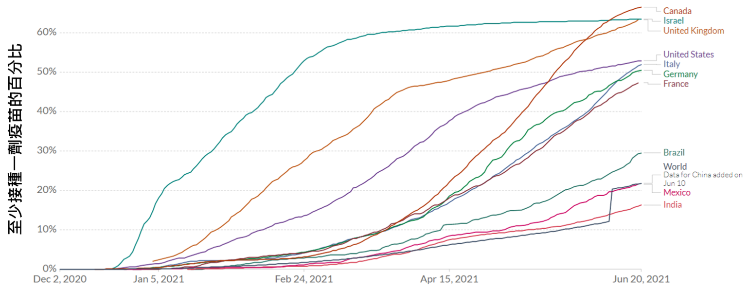 WHO估算至少7成人打疫苗 COVID-19疫情才會結束。下圖為世界幾個國家施打疫苗的情况。