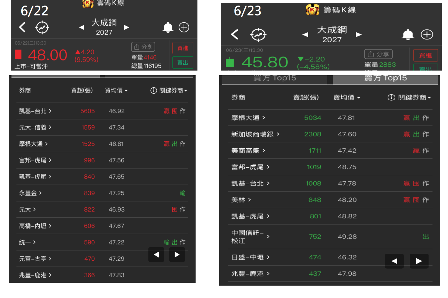 這次「氣」比較長的可能要數「凱基台北」,22日以46.92元吃下5605張的大成鋼,但23日只賣了1008張,賣在47.78元,單這一千多張就能獲利8百多萬元,然而手上還有4千多張,24日大成鋼收在46.5元,但早盤最高有到48.1元,若都順利脫手,例如賣在47.6元、47.8元,凱基台北這一波應該獲利也好幾千萬元了。