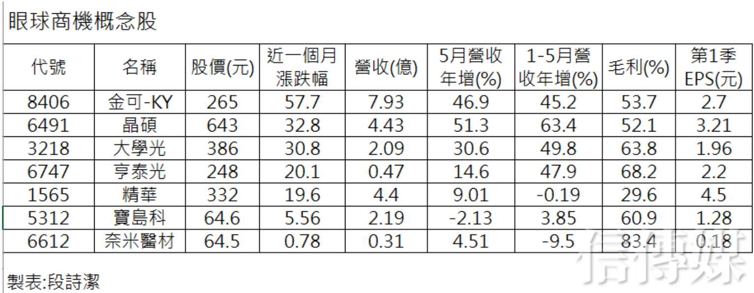 不過,還等不到解封,眼球概念股股價已經大漲。例如台灣最大連鎖眼科集團大學光從年初的242元一口氣大漲到450元,6月以來股價更大漲超過5成,24日收盤價386元。隱形眼鏡廠金可、晶碩股價也很威猛,近一個月來股價分別大漲57.7%、32.8%。