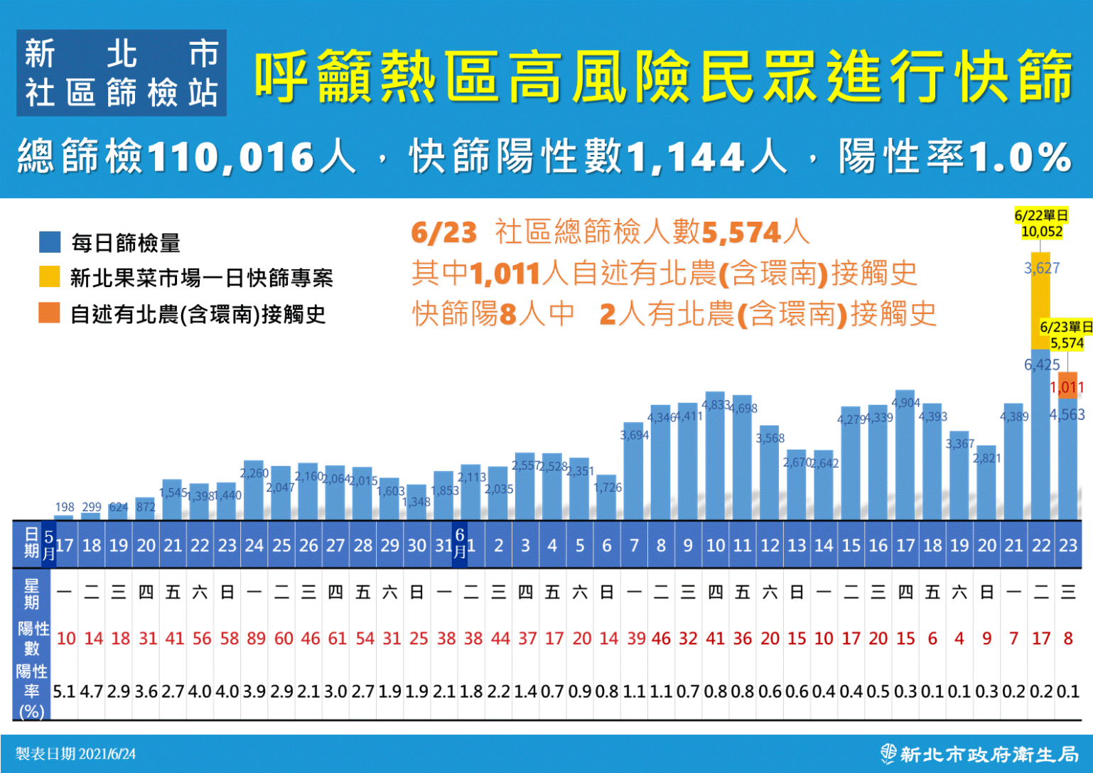 昨天篩檢量達5574人,仍比一般平日要高1000多人,又有1011人自述有北農和環南接觸史,而快篩陽的8人中,有2人有北農環南的接觸史,目前新北總篩檢量為110016人,快篩陽有1144人,平均陽性率已經降為1%。