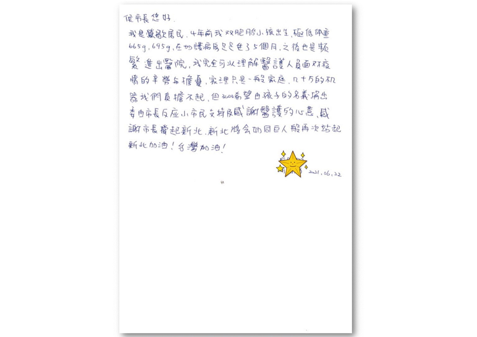 在疫情嚴峻的時刻,需要有正能量,侯友宜表示,自己經常接到鼓勵的信或卡片,他也感謝市民給他滿滿加油跟打氣,讓市府團隊在防疫不鬆懈,今天念了住在鶯歌的一名柯爸爸寫的信,讓他特別感動,這名父親有一對雙胞胎,因體重不足發展遲緩,經常進出醫院,深知醫護人員的辛苦,雙胞胎每月3000元的療育費補助,他願意出來幫第一線醫護人員打氣加油,讓侯友宜非常感動。