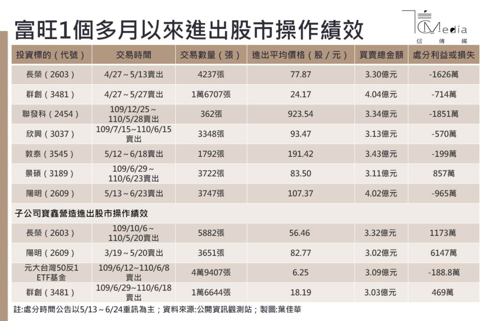 根據公開資訊觀測站揭露,富旺國際從5月中旬開始進出股市的標的就包括長榮、陽明等航運股,群創、聯發科以及IC載板欣興、敦泰、景碩等熱門股,另外,富旺子公司寶鑫營造也同樣延續母公司的作法,除了偏愛長榮、陽明等航運股之外,也關注元大台灣50反1 ETF基金、面板族群群創,整體來說合計近1個多月以來,富旺以及子公司寶鑫營造的處分利益仍有將近2532萬元。