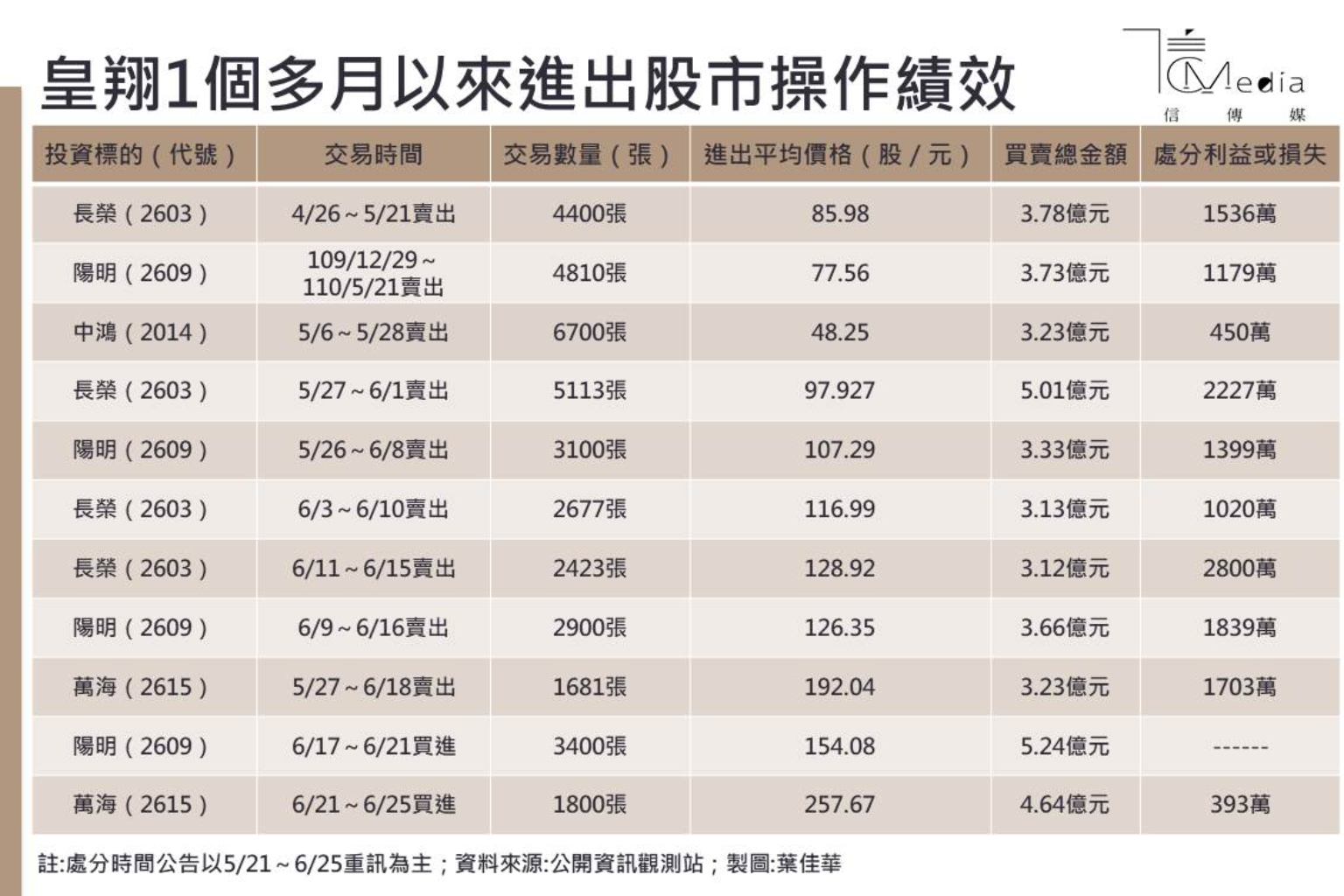 今年5月21日,皇翔公告處分長榮海運股票4400張,平均每股價格賣在85.98元,這筆處分利益就有1536萬元,同一天也同步公告處分陽明海運4810張,平均每股價格賣在77.56元,處分利益也大約有1179萬元。