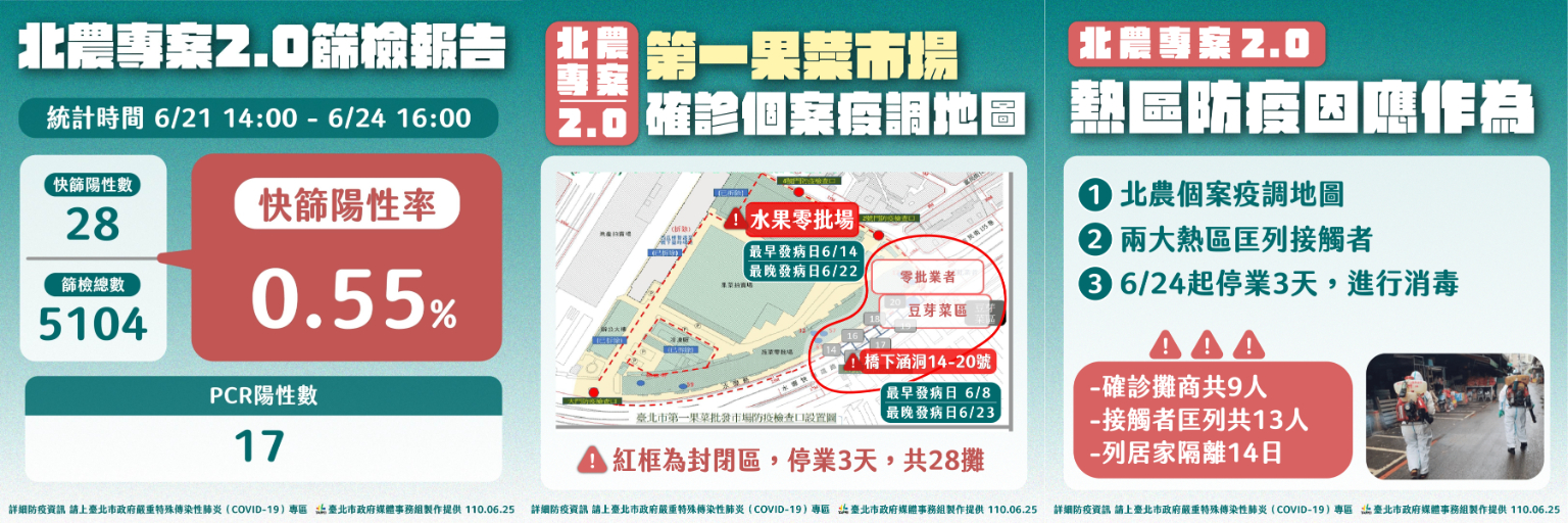 黃珊珊表示,批發市場熱區處理原則是「先封鎖場域,再從疫調追查人」,25日上午已請中央協助聯絡其他縣市,做到北農疫調時先區分市場(第一果菜、濱江)、攤商(蔬菜、水果)並註記攤商編號,以加快北市查證作業。