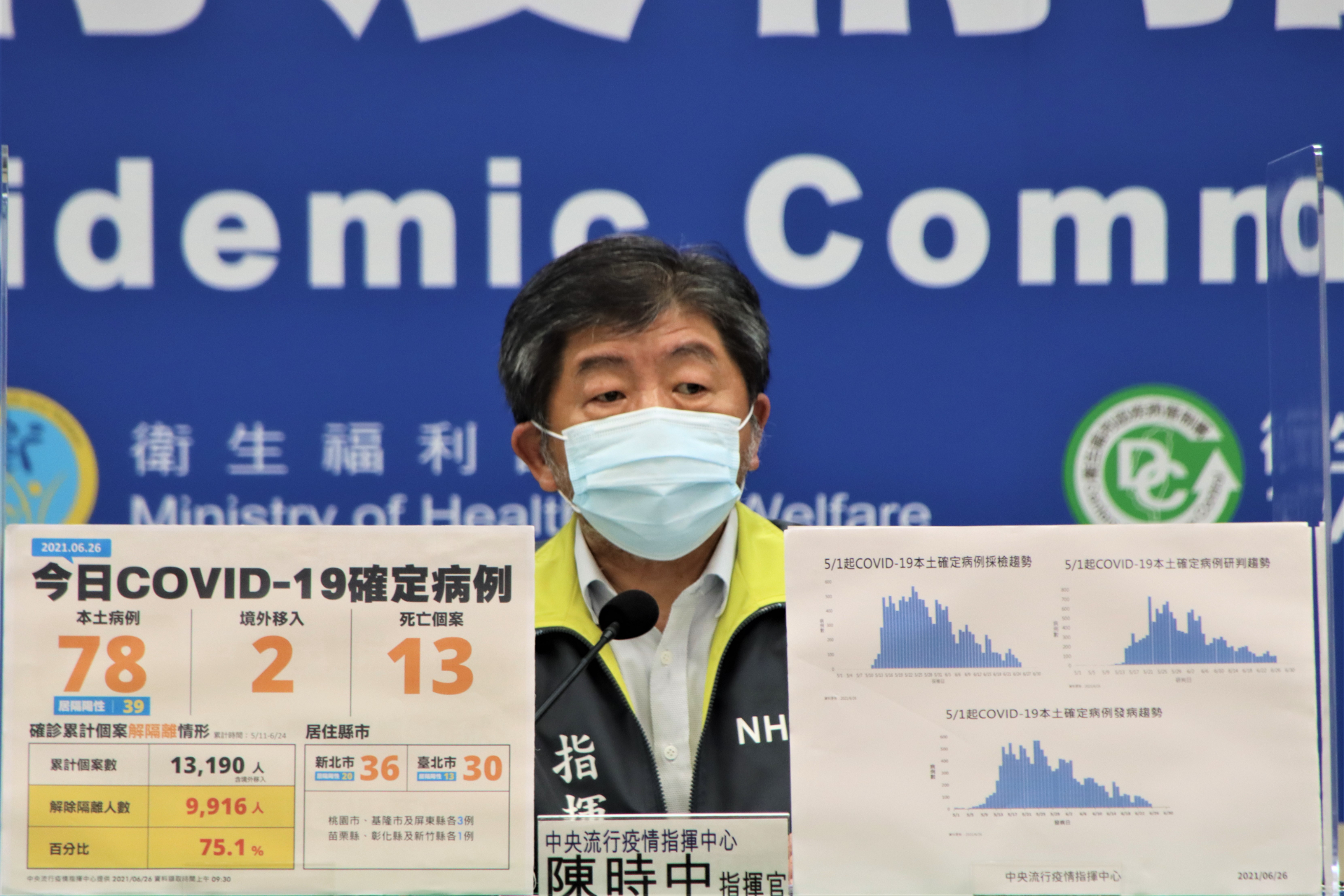 指揮中心指揮官陳時中表示,今日新增之78例本土病例,為36例男性、42例女性,年齡介於未滿5歲至80多歲,發病日介於今年6月11日至6月25日。個案分佈以新北市36例最多,其次為臺北市30例、桃園市、基隆市及屏東縣各3例,苗栗縣、彰化縣及新竹縣各1例。其中雙北地區以外縣市12例中,10例為已知感染源、2例關聯不明;相關疫情調查持續進行中。