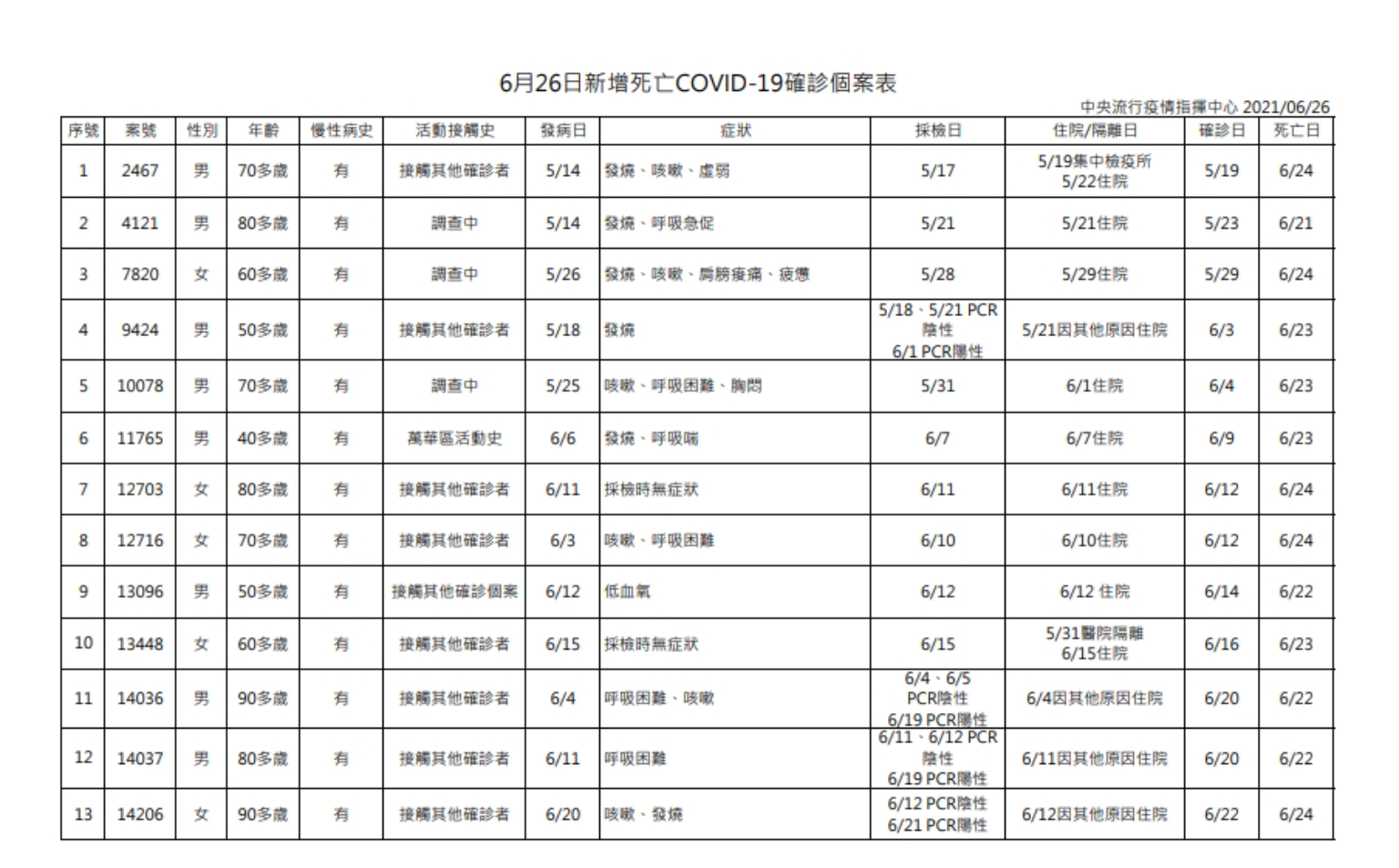 陳時中說明,今日新增13例死亡個案,為8例男性、5例女性,年齡介於40多歲至90多歲,發病日介於5月14日至6月20日,確診日介於5月19日至6月22日,死亡日介於6月21日至6月24日,詳如新聞稿附件。