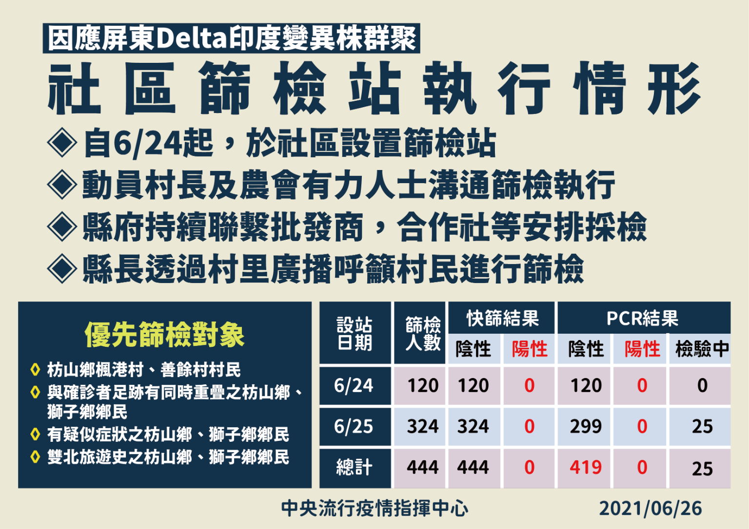 二、6月24日起於當地設置社區篩檢站,籲請足跡重疊民眾篩檢,並加強民眾溝通配合篩檢,截至6月25日PCR篩檢共419人皆為陰性;另針對確診個案公布社區足跡點,並完成公共場所消毒。