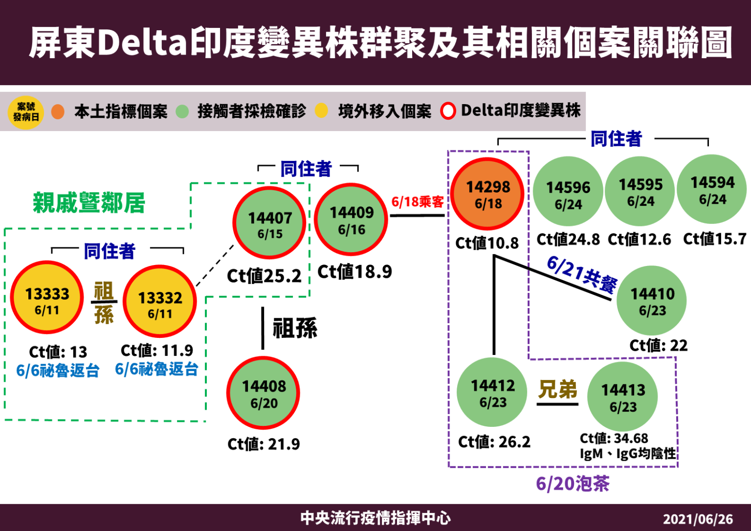 中央流行疫情指揮中心今日表示,有關屏東COVID-19 Delta印度變異株群聚及其相關感染事件,目前累計12例確定病例,其中6例經基因定序後,均為Delta印度變異株,分別為秘魯境外移入確診祖孫2人(案13332、13333)及案14298、14407、14408、14409。