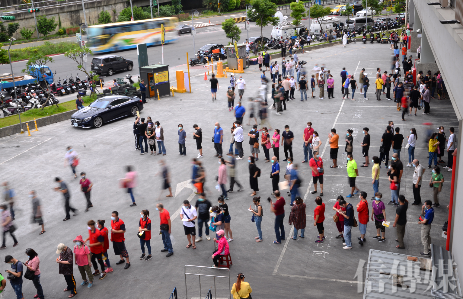 位於萬華的環南市場陸續有攤商確診,今(28)日上午相關人員在市場依序排隊報到。(攝影/趙世勳)