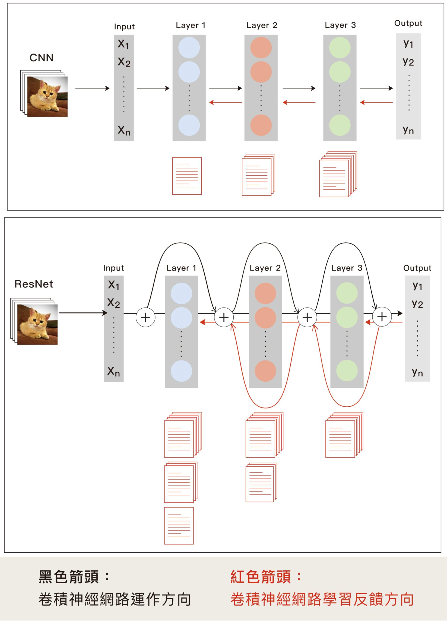 那麼,哪一步改善後可以大幅提升表現呢?王建堯找到的關鍵是:學習的反饋過程。當卷積神經網路的網路層數愈多,在訓練階段,因為反饋計算方式,每回傳一層就會損失一些資訊,越前面的網路層學習到的東西越少,稱為「梯度消失問題」(vanishing gradient problem)。