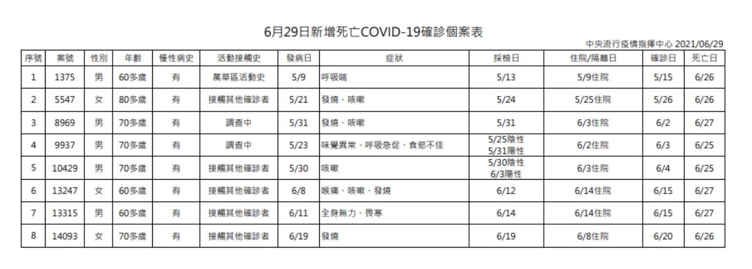 陳時中說明,今日新增8例死亡個案,為5例男性、3例女性,年齡介於60多歲至80多歲,發病日介於5月9日至6月19日,確診日介於5月15日至6月20日,死亡日介於6月25日至6月27日;詳如新聞稿附件。