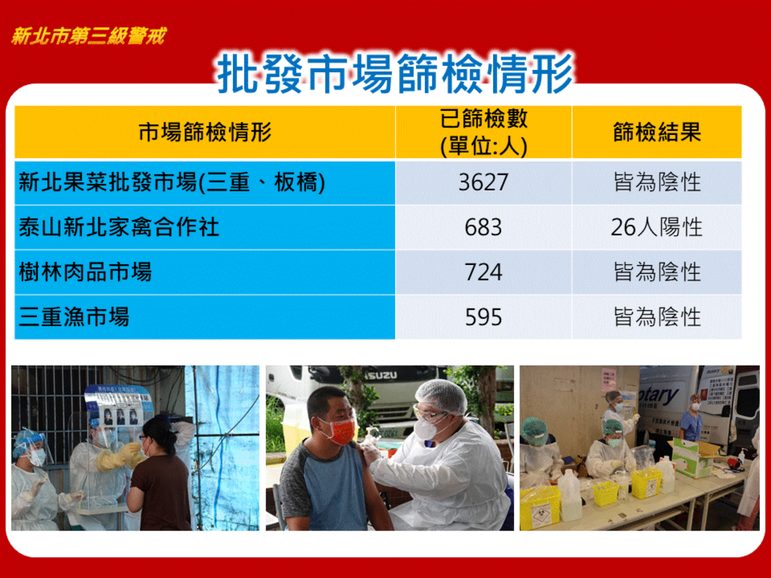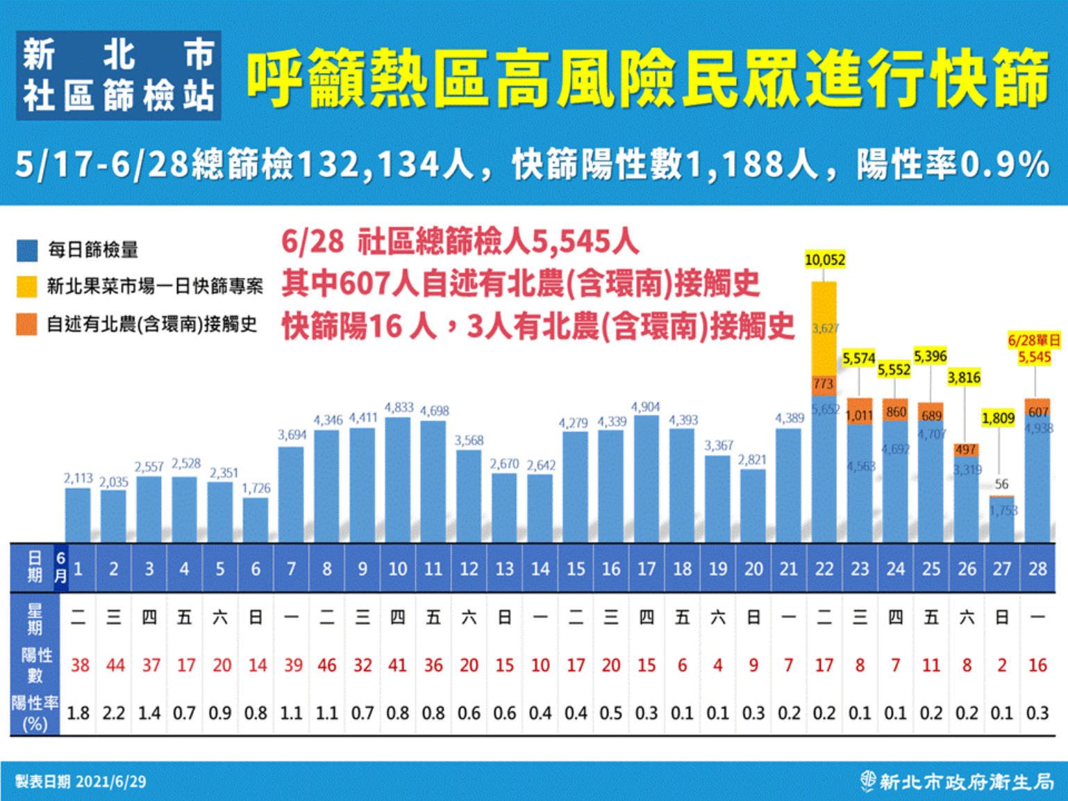 新北市長侯友宜在北農群聚事件後格外注意各批發市場的群聚問題,到昨天為止,新北全市篩檢站總篩檢量達13萬2134人,共有1188人陽性,平均陽性率0.9%,而昨天篩檢量5545人,仍然有607人有北農或環南市場接觸史,16人快篩陽性,陽性率0.3%,有3人有北農或環南市場接觸史。