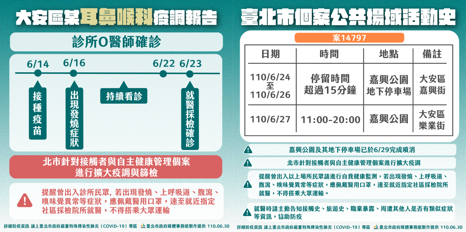 從出現症狀到確診這7天,上圖醫師曾為200多名病患看診,他們並未被匡列,台北區管防疫醫師建議僅需自主健康管理,然北市鼓勵這200多人接受篩檢,於是尋獲案14797;其他病患目前篩檢結果皆為陰性,但還有100多人尚未出來檢驗。