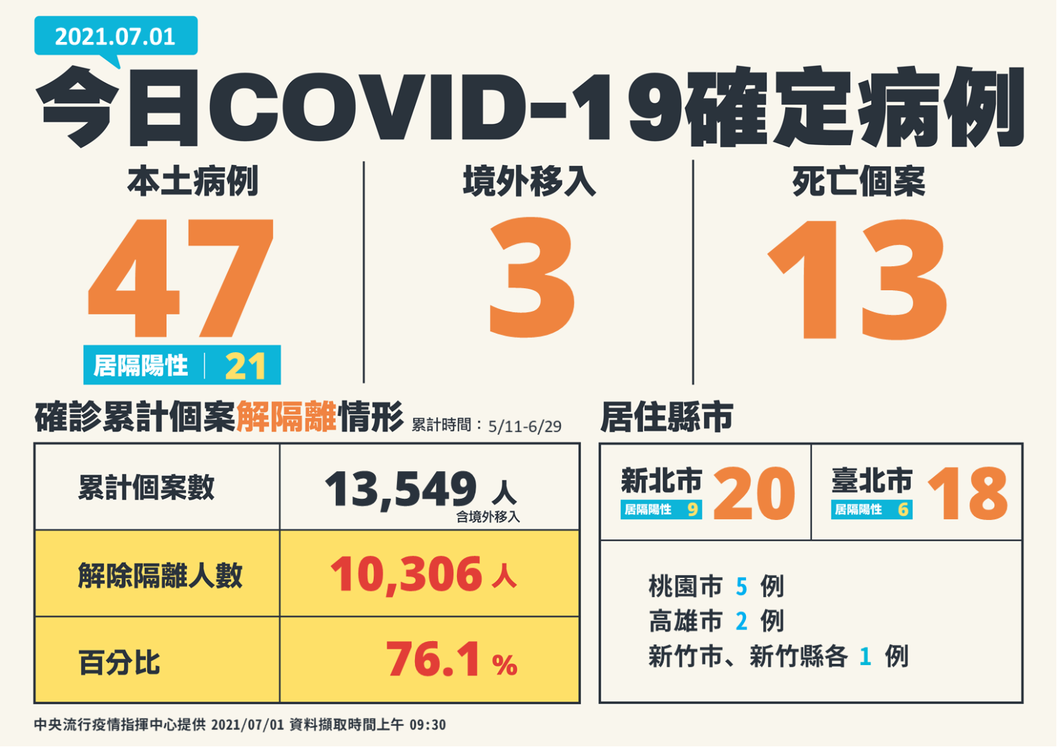 指揮中心指揮官陳時中表示,今日新增之47例本土病例(其中21例為居家隔離期間或期滿檢驗陽性者),為22例男性、25例女性,年齡介於未滿5歲至90多歲,發病日介於今年6月22日至6月30日。個案分布以新北市20例最多,其次為臺北市18例、桃園市5例、高雄市2例,新竹市及新竹縣各1例;其中28例為已知感染源、3例關聯不明、16例調查中,相關疫情調查持續進行中。