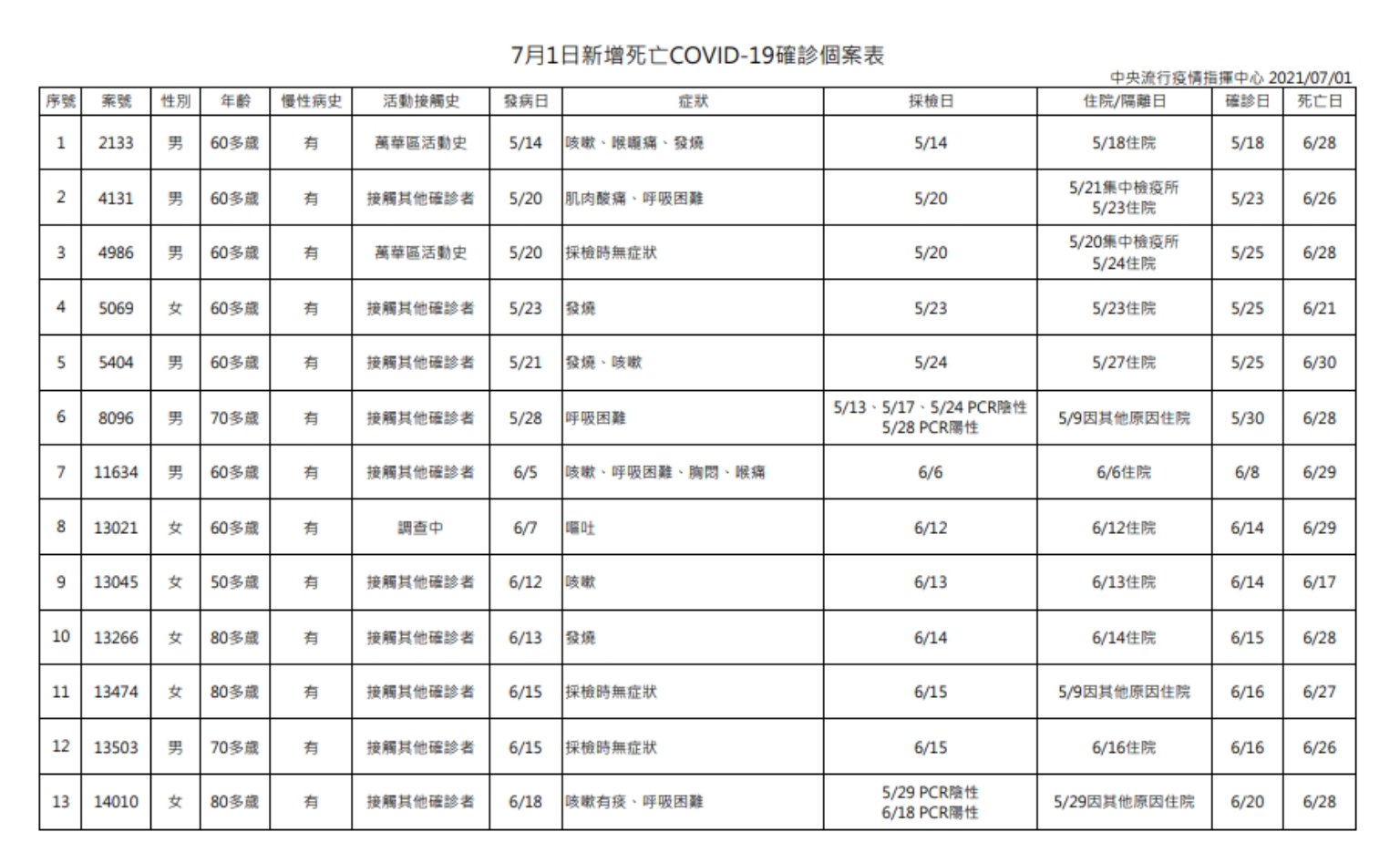 陳時中說明,今日新增13例死亡個案,為7例男性、6例女性,年齡介於50多歲至80多歲,發病日介於5月14日至6月18日,確診日介於5月18日至6月20日,死亡日介於6月17日至6月30日;詳如新聞稿附件。