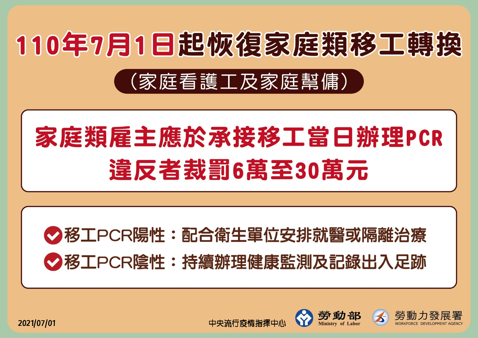 中央流行疫情指揮中心今日表示,本土確診案例連續1週低於百人,經考量失能者家庭照顧需求,及家庭較無其他替代人力,且不致有產業移工群聚擴大傳染風險等因素,自即日起優先恢復外籍家庭看護工及家庭幫傭,得轉換由家庭類雇主接續聘僱(含期滿轉換);至於其他產業移工仍暫緩轉換,未來將視疫情再行檢討。