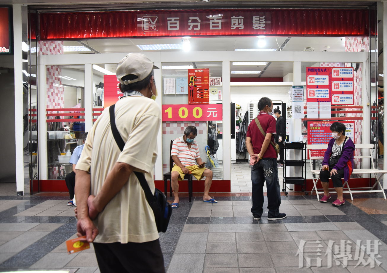 萬華地下街的百元理髮店,營業前半小時便有顧客到店門口前報到,睽違一個多月許久終於可以剪頭髮,百元理髮店員工則是會拿出椅子請客人相隔1.5公尺等候,互相做好安全措施,畢竟民眾都還沒打疫苗,大家都會緊張。