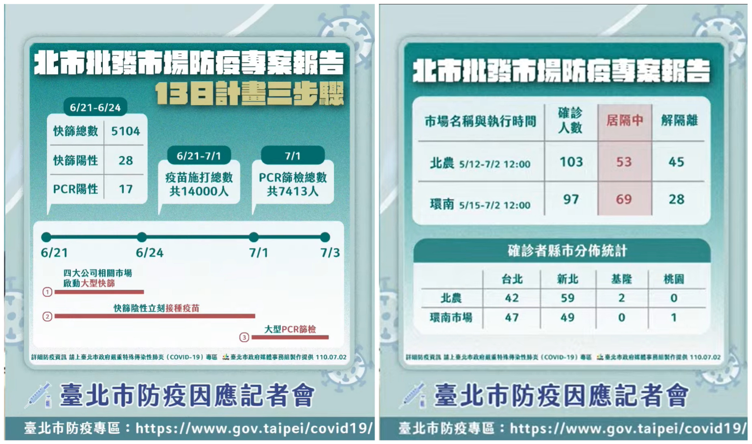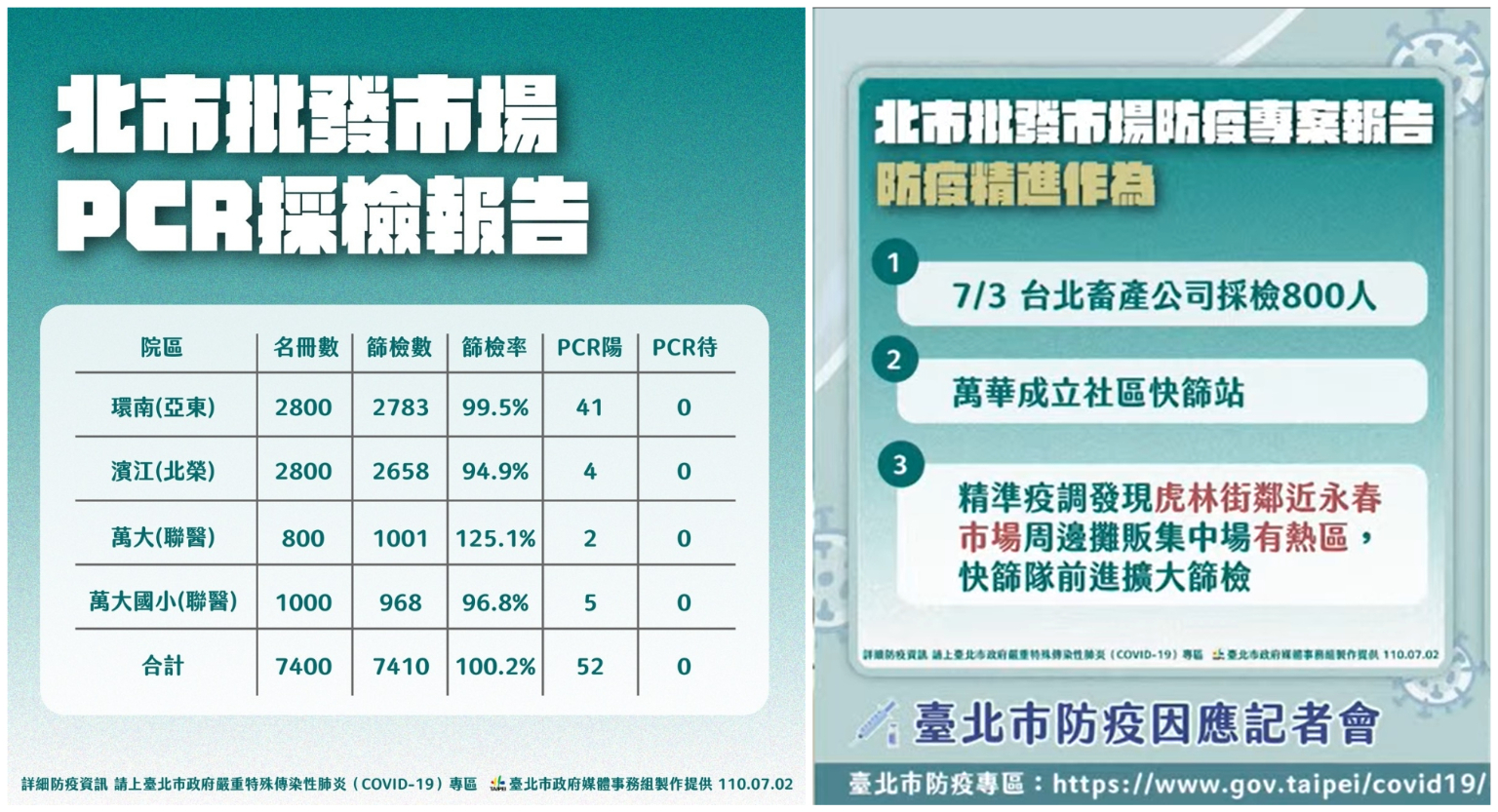 根據北市府分析,市場儼然成為最大感染源,柯文哲認為病毒是從萬華社區傳至第一、第二市場,再傳到環南市場,目前就怕病毒再繼續擴散至其他市場。因此除了北農批發市場,南門市場、永樂市場、永春市場等曾出現確診案例的市場,也將優先普篩。
