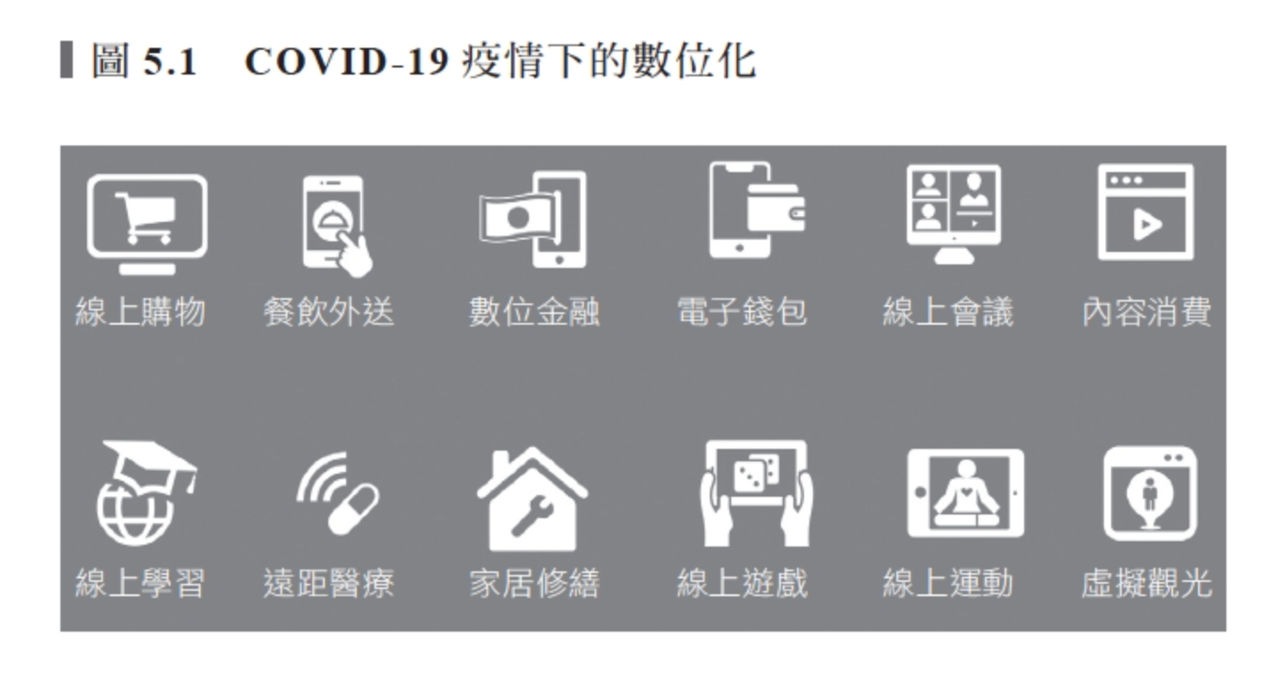 由於顧客被迫在家中待上數個月,因此確實已習慣了新的數位生活方式。他們依靠電商和餐飲外送應用程式來購買日用品。數位銀行與無現金支付的數量大幅上升;他們也透過Zoom和Google Meet等視訊會議平台進行線上會面;孩子在家中透過線上平台學習,父母則在家工作;為了消磨時間,一般大眾更常使用YouTube和Netflix來觀賞串流影片;而有鑑於身體健康變得重要,健身教練或醫生也得進行遠距指導,參見圖5.1。