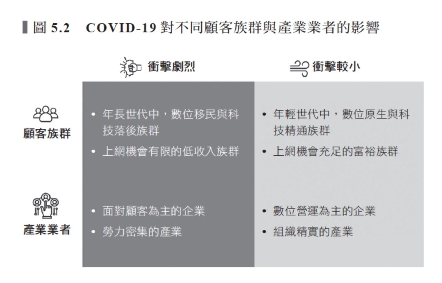 同理可證,疫情看似對部分產業帶來比較嚴重的困境,但沒有企業能完全不受疫情的影響。需要較直接實際互動又勞力密集的產業,可能會受到比較大的打擊。另一方面,營運高度數位化、組織又精實的產業可能適應較為良好,參見圖5.2。