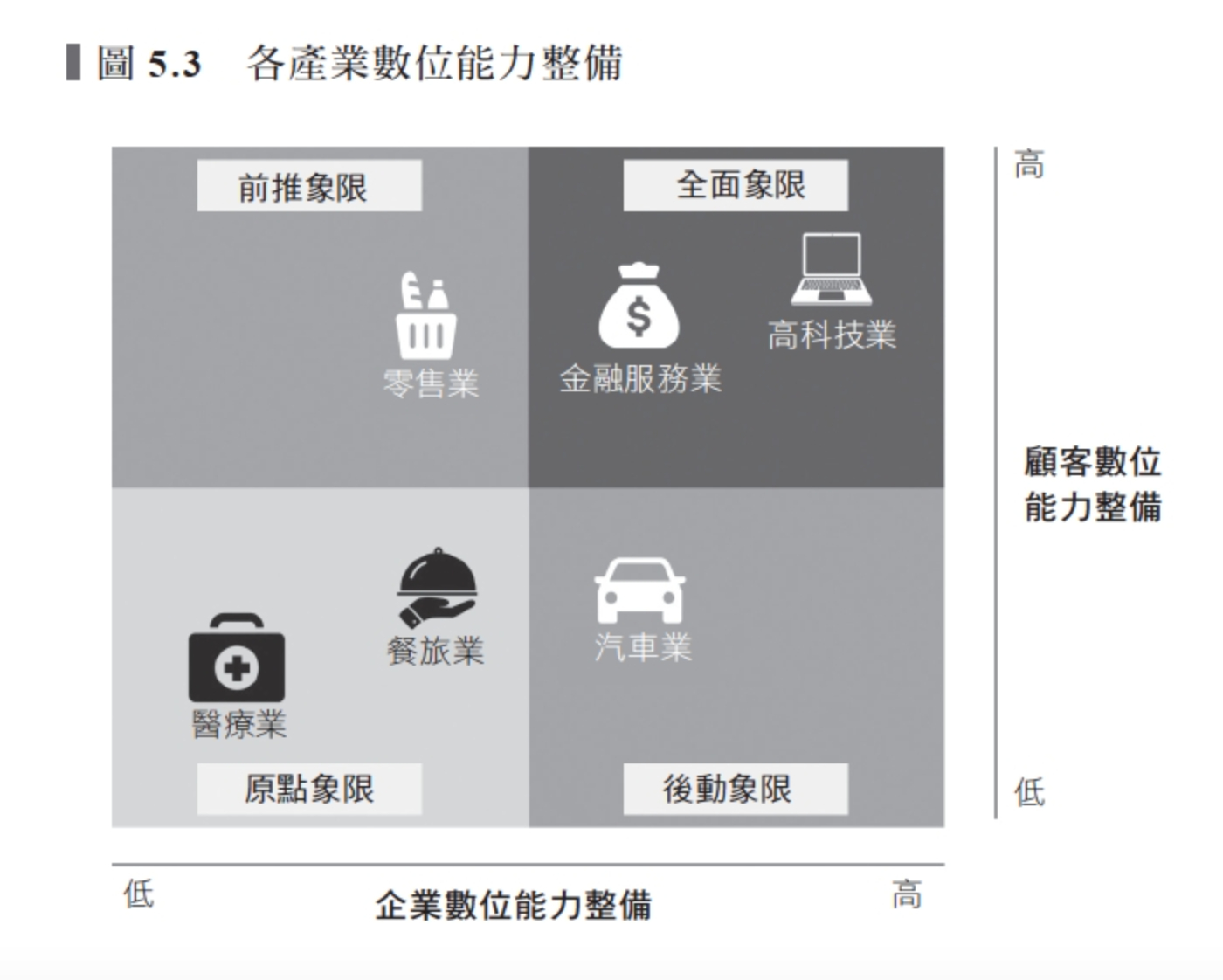 為了說明象限中的四個類別,我們評估了六個產業部門的數位能力整備:高科技、金融服務、雜貨零售、汽車、餐旅和醫療保健。每個產業的落點是基於美國當前的情況,久而久之可能會隨著市場發展而變化。其他市場的顧客可能整備不一。每個產業業者的整備也可能各異,參見圖5.3。
