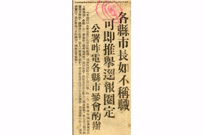 現各地秩序,逐漸恢復,該縣市縣市長如人民認為稱職,希即全力協助恢復地方秩序,繼續執行職務,若是人民認為不稱職,可由該會或會同其他合法團體,共同推舉3名,逕報候選圈定,希於電到3日內辦竣,逕報公署核辦。