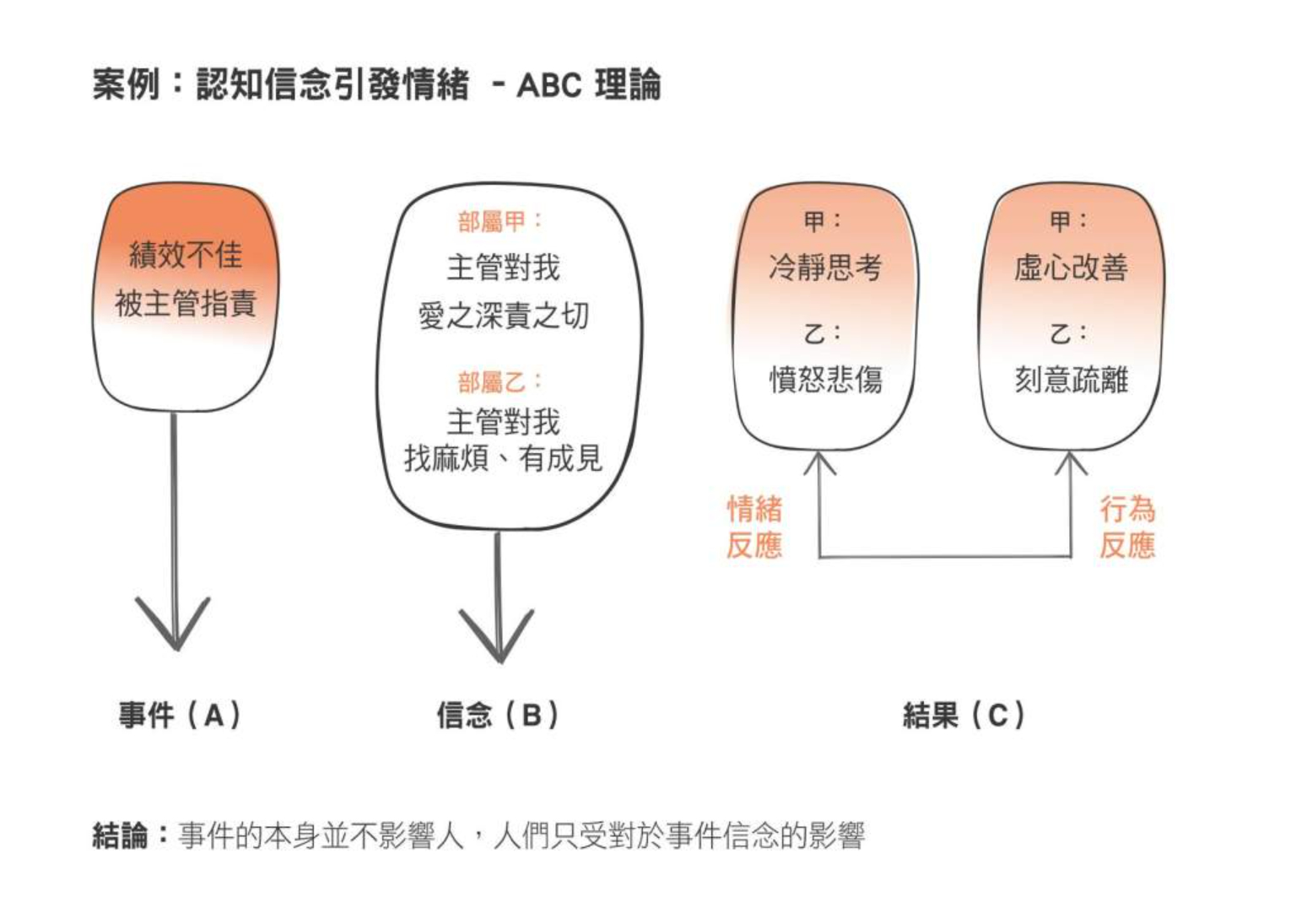 人對事件的情緒反應,是與這個人對事件的認知有關。例如,部屬被主管責備事件發生後,除了事件本身,還有個人對事件的看法與解釋,會令人產生不同的情緒。如果部屬的認知信念是「主管刻意刁難」,或是「主管愛之深,責之切」,就會產生不同的情緒與行為。這當然牽涉到個人的主觀認知與實際情境,但「信念」的再次檢視,會有更客觀的選擇。