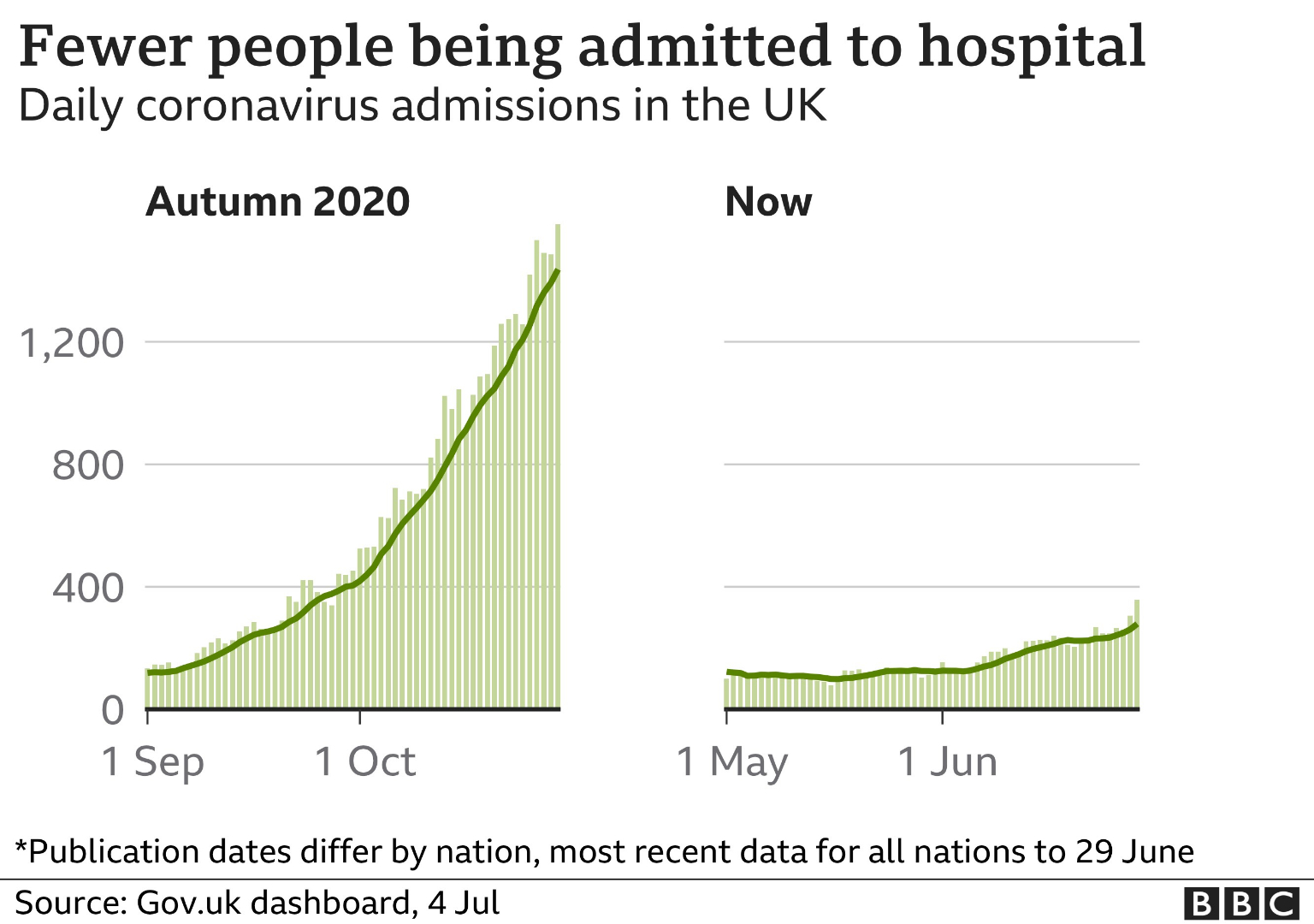 7月2日,英格蘭通報新增確診27,714例。 331 人住院,住院率僅為1.1%。7月4日,威爾斯新增535病例,沒有人死亡。