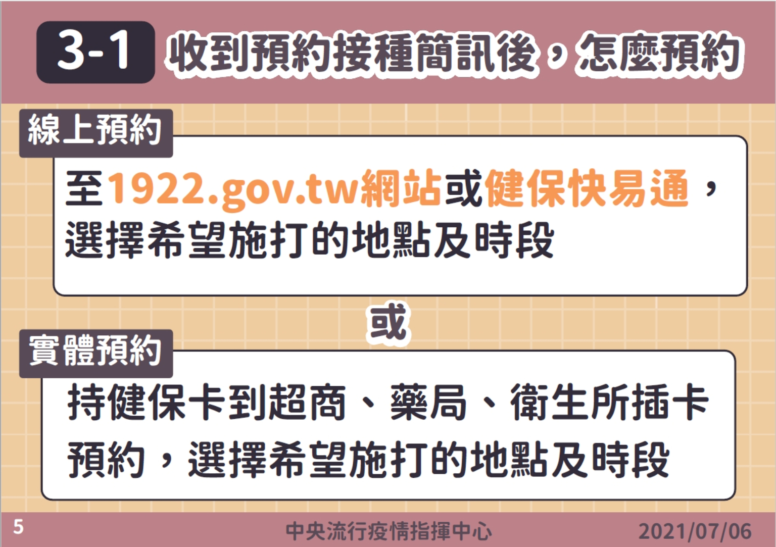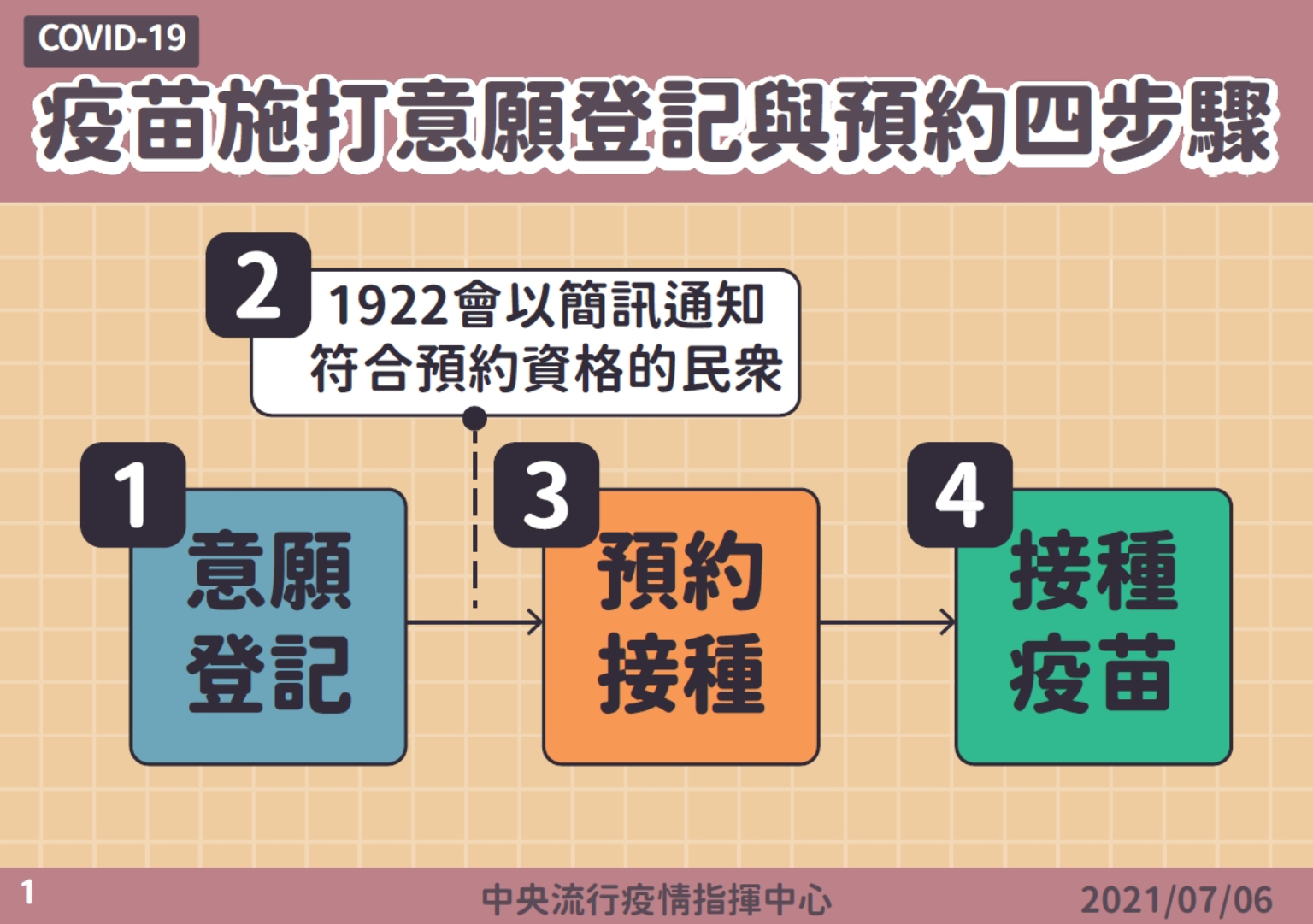 唐鳳表示,與各縣市政府溝通後,大多認為疫苗預約平台以以64歲以下為比較適合的啟動條件,執行步驟包括意願登記、簡訊通知、預約接種,及接種疫苗,民眾可前往「COVID-19公費預約平台」,填入身分證號與健保卡左下角的健保卡號即可登記。
