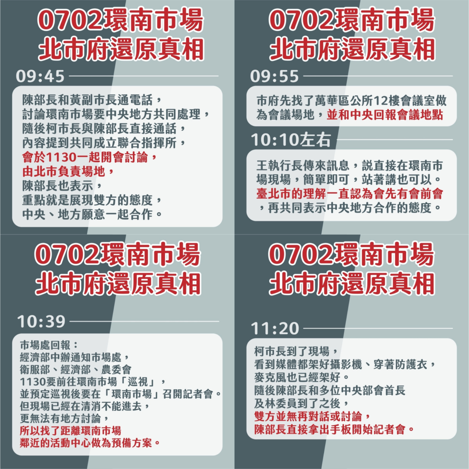 北市府8日公布自己版本的「環南市場記者會真相」,2日負責與中央聯繫的台北副市長黃珊珊強調「我接到的訊息就是要開會」,因此「我們從頭到尾都跟市長報告要去禮堂開會」。