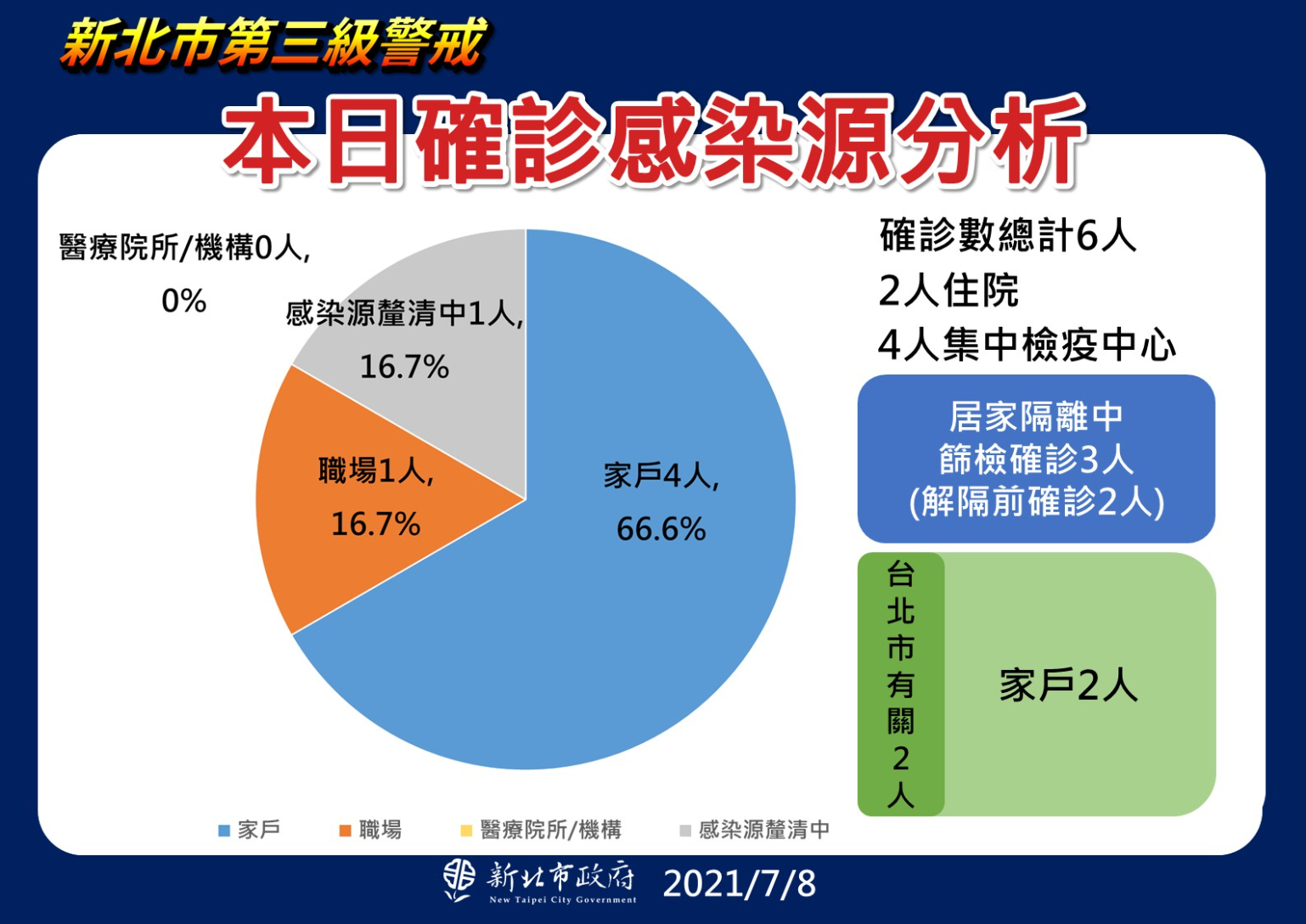 新增的確診案例在感染源分析中,家戶感染4人最多,職場1人、不明感染源1人,其中職場部分有1名板橋居民在新竹縣工地工作,該工地有多名工人確診,他也受到感染,而較讓人擔憂的不明感染源為三重居民,足跡曾遍及台北市及台中市,但感染源還沒找到,為慎重起見,新北市府已經立即向台北市、桃園市、新竹縣、台中市、基隆市,通報相關足跡,落實區域聯防。