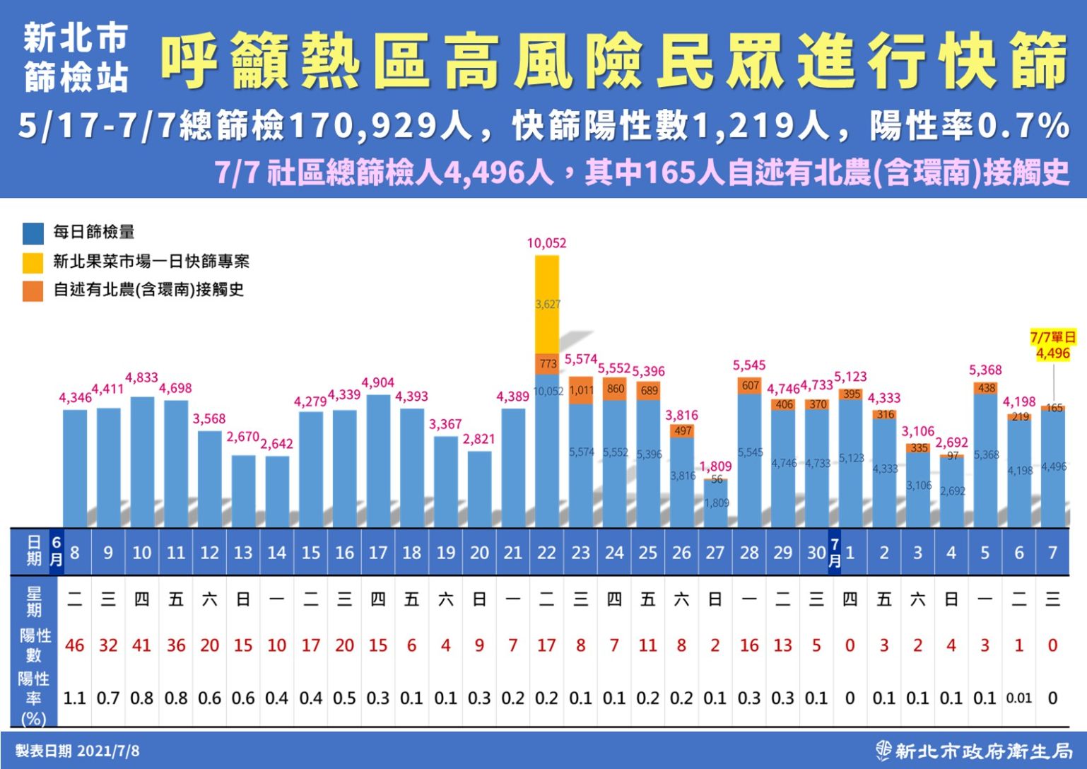而侯友宜今天特別公布一大喜訊,從5月17日到7月7日,新北市社區篩檢站總篩檢量達到17萬929人,快篩陽性數1219人,陽性率0.7%,昨天社區總篩檢量為4496人,有165人自述有北農環南接觸史,結果出爐4496人全部都是陰性,繼上周四到今天,這一個禮拜當中,有2次篩檢到「0陽」。
