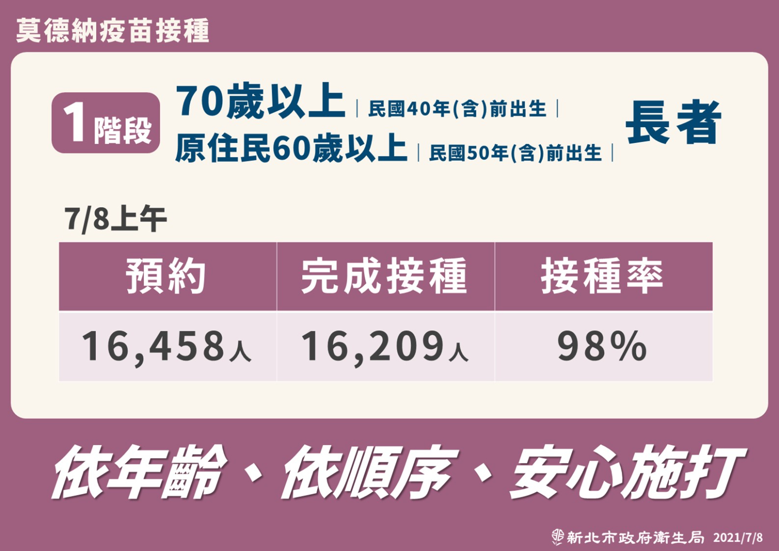 新北市今日開放70歲以上、原住民60歲以上,民眾反應依舊踴躍,以今天上午來說,總預約人數1萬6458人,完成接種人數為1萬6209人,比例高達98%,侯友宜也接著宣布下一波疫苗施打名單,67歲以上(原住民57歲以上),可於7月10至11日開放預約接種莫德納疫苗,7月12至13日分時段施打,也因應人數越來越多,這次共有327處可接種。而第三階段65歲以上(原住民55歲以上)預約時間則是12日至13日,接種時間為14日至15日。