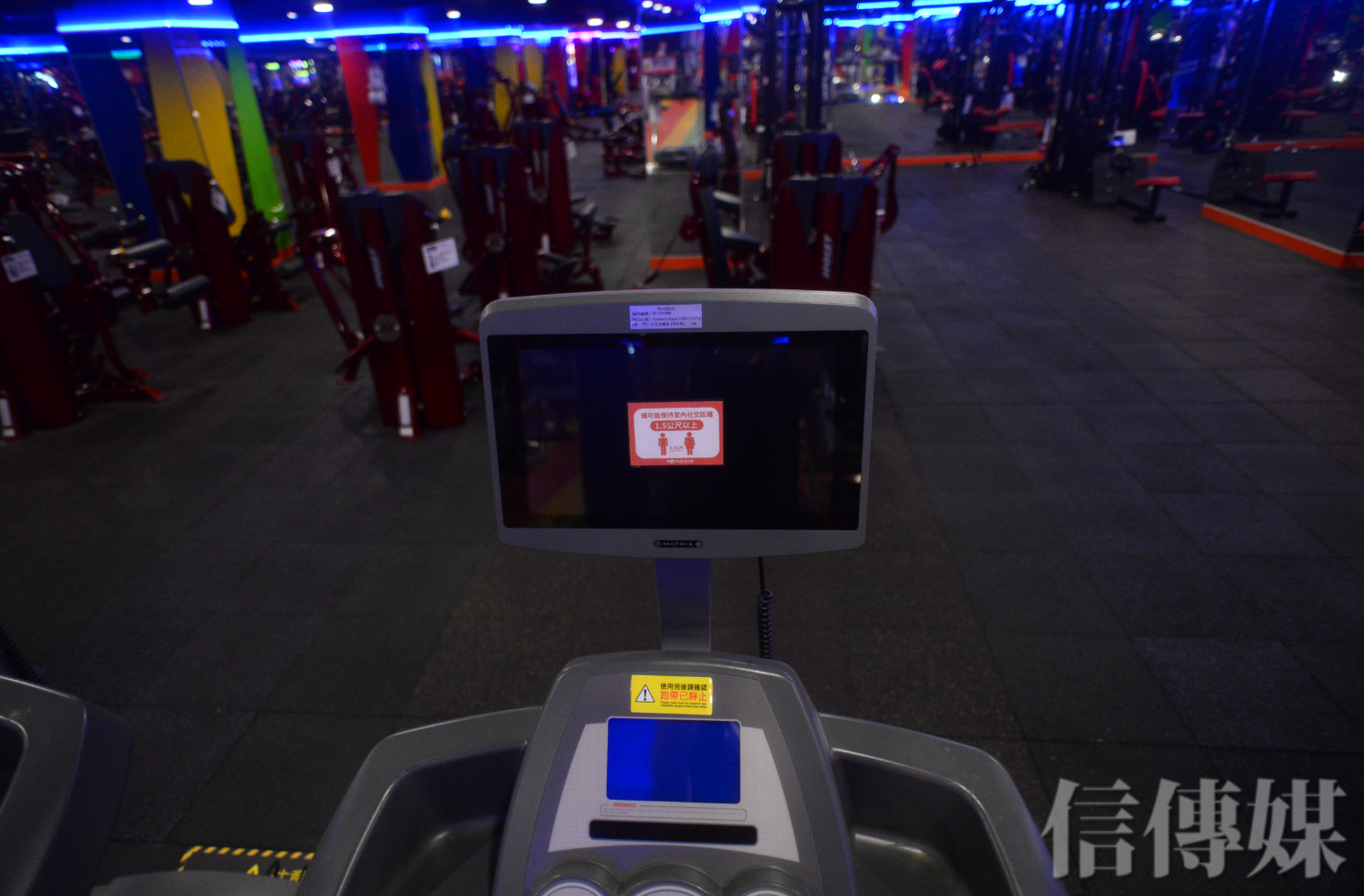 健身房器材上標示學員彼此需要距離1.5公尺。(攝影/趙世勳)
