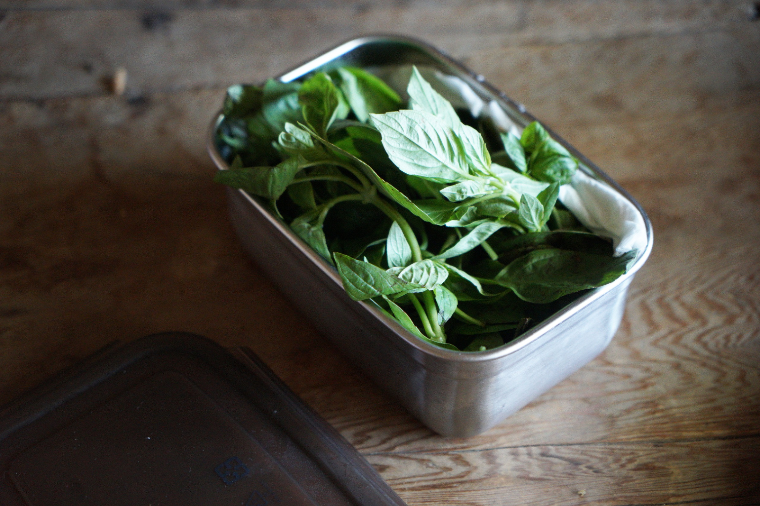 除了按照葉菜含水量及到貨時的狀況排序,幾樣我珍重得不得了的「特殊權貴」有特殊待遇,香菜跟九層塔都是。嬌滴滴的這幾位,不易保存,但我太愛它們的香氣。取來一個乾爽的保鮮盒,鋪墊一張廚房紙巾,把九層塔鬆鬆的放進去,蓋緊保鮮。或一束一束像包花束那樣,把香菜包好,放保鮮盒或保鮮袋鎖緊。然後它們就在我擠得不得了的冰箱中,有自己的套房,可以一住一、兩個禮拜,出來還清爽可人,像噴好了香水。
