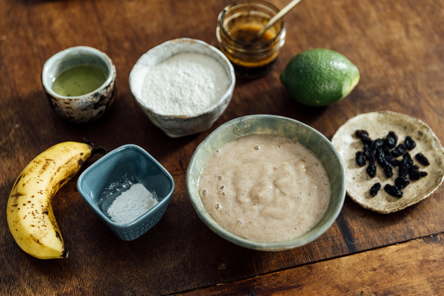 第二道「香蕉米旦糕」,由於材料沒有使用雞蛋,因此稱作「旦糕」而非「蛋糕」。馮晏緹提醒,「糙米粉製成的糕體比一般麵粉製成的成品更為扎實,加上糙米粉的磨製方式、存放環境等因素會影響成品的品質,因此不推薦使用市售糙米粉,建議於製作前使用高速果汁機、磨豆機或食物調理機等機器自行研磨,確保糙米的香味與營養不因接觸空氣過久而流失。」