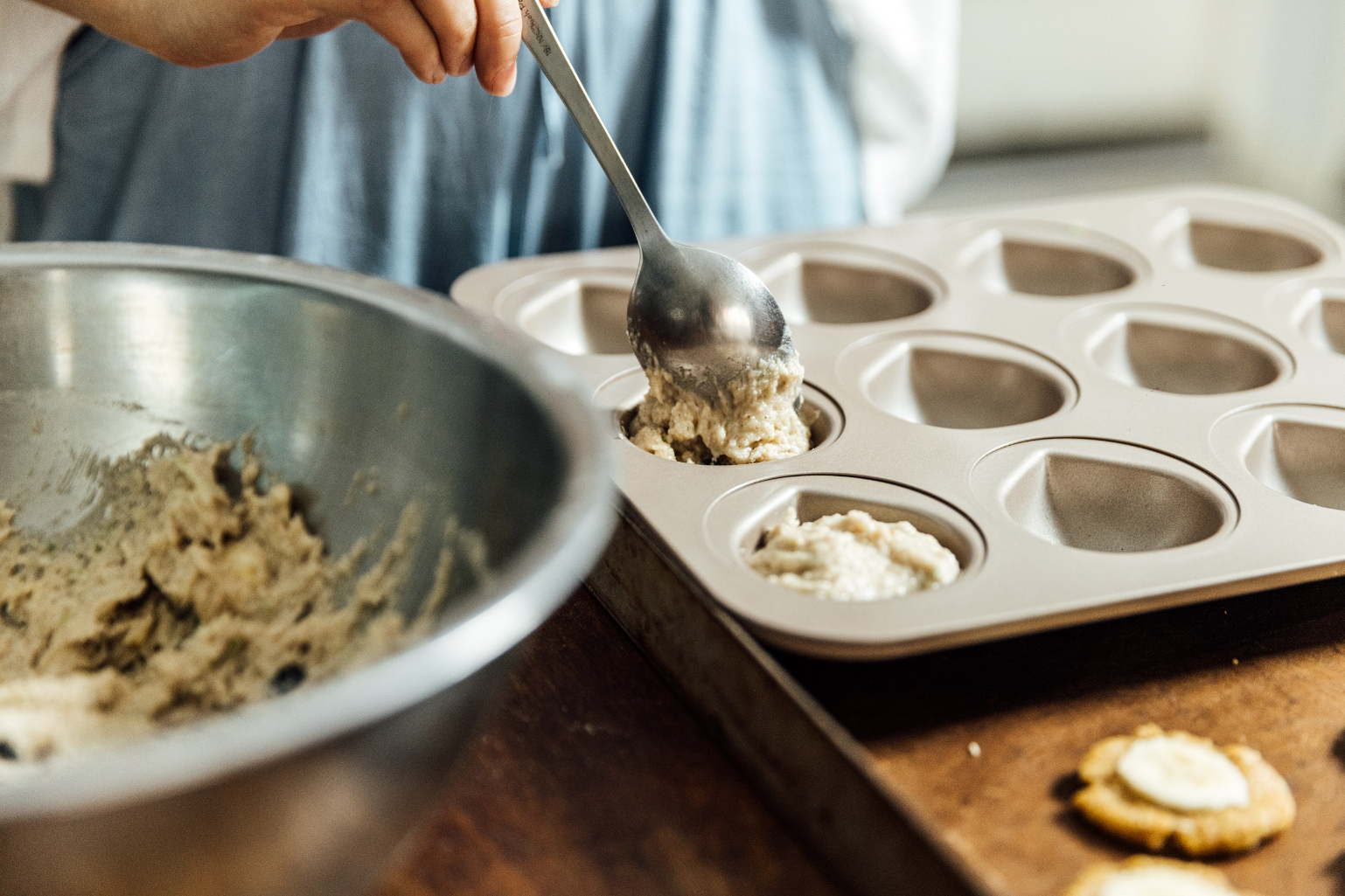 4. 將混合後的粉糊倒進烤模,調整單一重量約40公克。