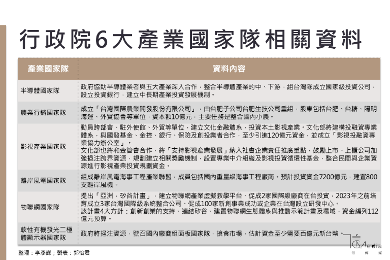 蔡英文當選後、就任前,進行一次產業之旅,每參觀一項重大產業,就宣示政府會協助民間組建「國家隊」,準備進軍「國際盃」。蔡英文競選總統時的政見,提到5大產業,在參訪半導體產業後,就將其加入,總共有6大國家隊,其他還有農業、影視、風電、面板及物聯網。